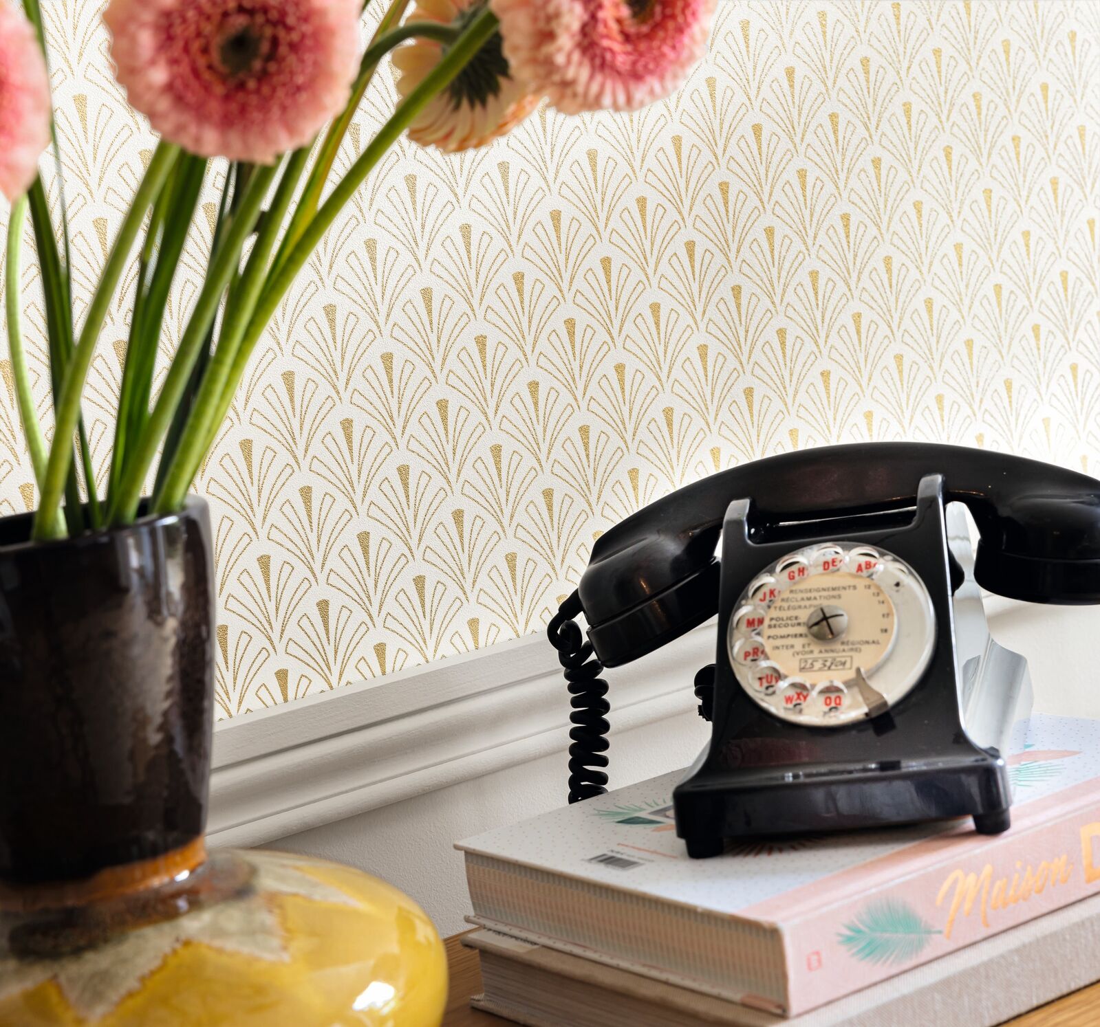 The ÉLÉGANCE collection is dedicated entirely to the art deco trend we love so much. Back to the basics: forget the revisited patterns of other seasons and go back to basics. We are bringing out the chic palmettes, geometric shapes, simple arches and elegant stripes... always with a touch of gold. Made from phthalate-free non-woven vinyl, the wallpaper range is easy to hang in any room of the house (kitchen, bathroom, bedroom...).