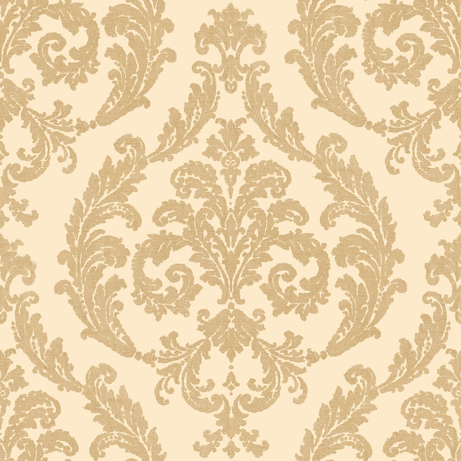 Reminiscent of ancient architecture, an ornamental damask is luxurious and inviting. With swirling acanthus leaves arranged in a classic damask formation and a rich silk-like texture featured throughout, this design is sure to wow. The Gold colourway features a soft gold base with damask florals in a bolder metallic gold shade.