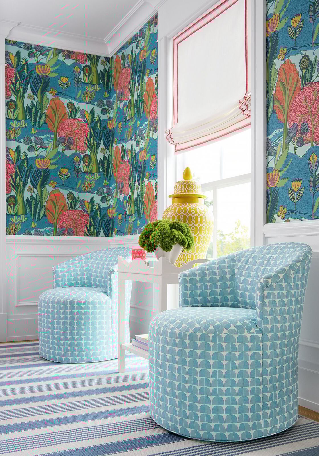Travel-inspired wallcoverings and fabrics satisfy the desire to see the world with patterns of fanciful foliage and tulip gardens seen in Europe, sleepy romantic vines of the South, or bold tropical mangroves. Painterly and whimsical designs are balanced by modern geometrics, and saturated tones are met with soft romantic shades like apricot and ginger. The breadth of the Wanderlust collection provides an escape of all kinds — from energetic and lively getaways to rest and relaxation.