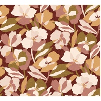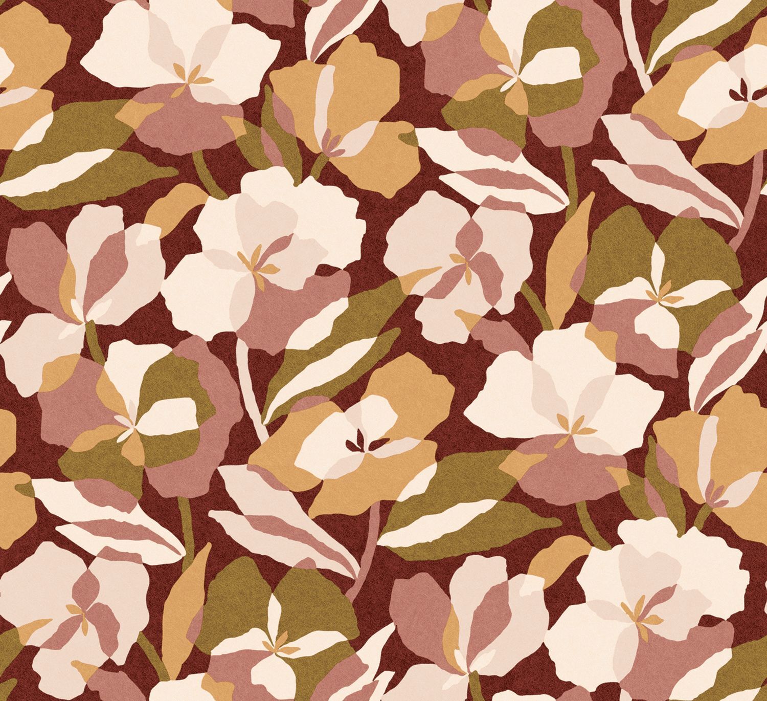 Often blooming in the depths of winter, its majestic flowers are held by long stems, the amaryllis is the epitome of elegance. Stylised and printed as planes of colour on a base with the look of blotting paper, the AMARYLLIS take centre stage in this contemporary composition, blending deep shades and overlapping flowers. A golden or coppery metallic films adds a touch of sophistication.