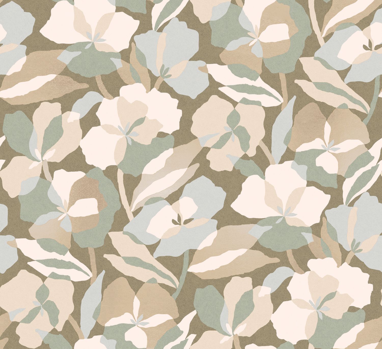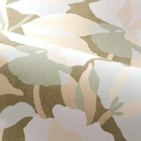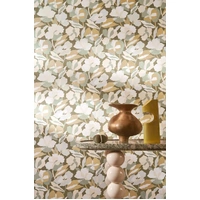 Often blooming in the depths of winter, its majestic flowers are held by long stems, the amaryllis is the epitome of elegance. Stylised and printed as planes of colour on a base with the look of blotting paper, the AMARYLLIS take centre stage in this contemporary composition, blending deep shades and overlapping flowers. A golden or coppery metallic films adds a touch of sophistication.