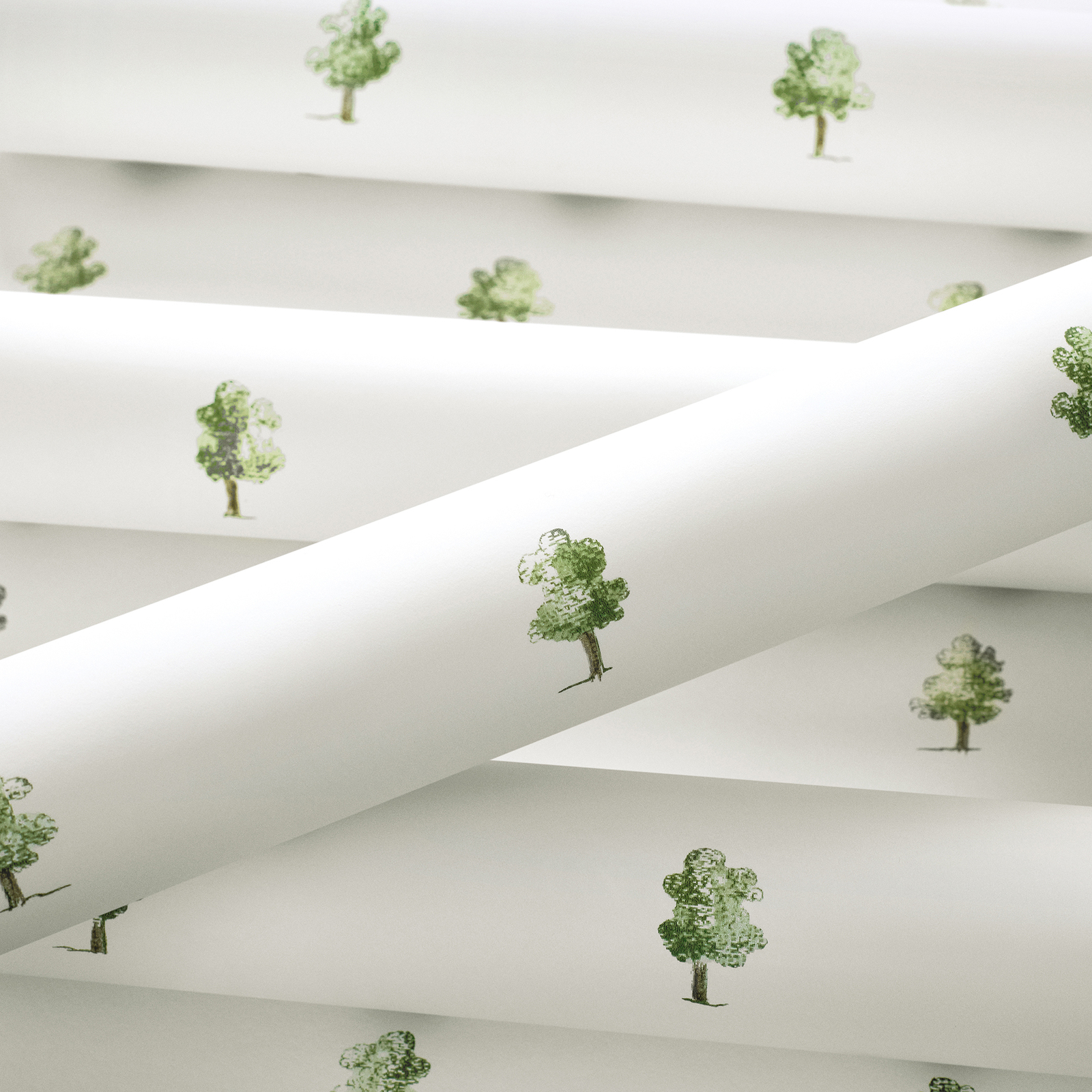 Inspired by the Whitcombe Park Mural, the Ashton wallcovering features a solitary ash tree plucked from the etching, spaced on an open ground. A subtle and simple touch of whimsy for any space. Derived from Reprotique's private collection. The Green colourway features a soft white base with vibrant green tree motifs.