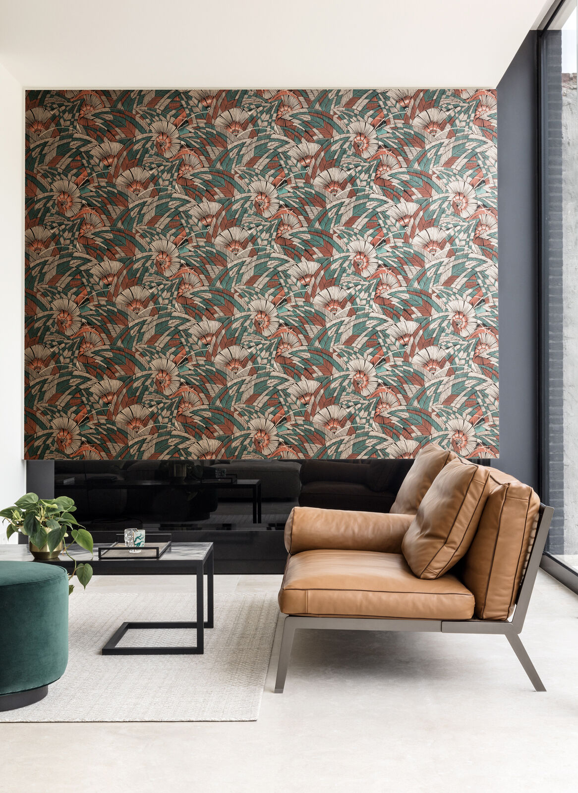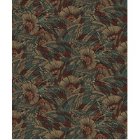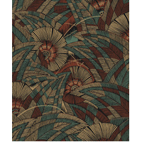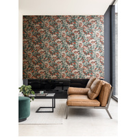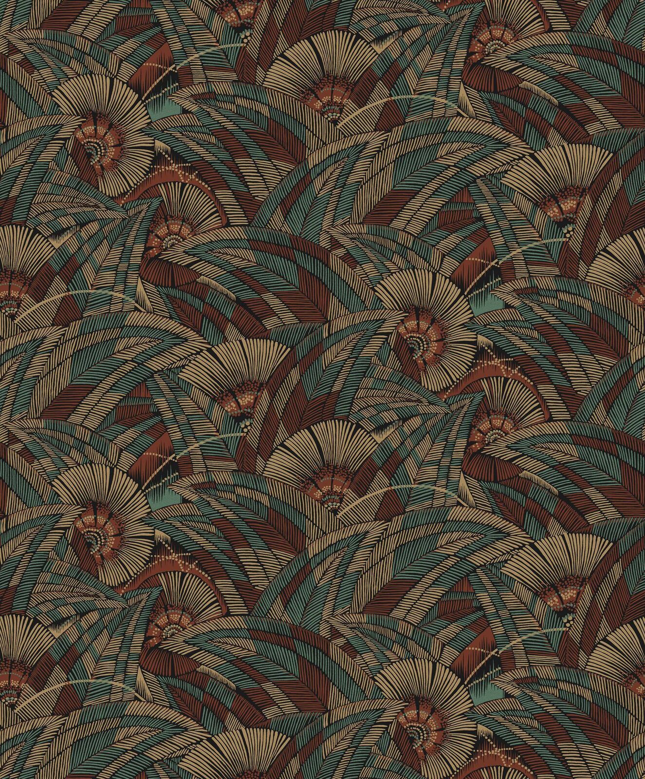 A contemporary jungle floral design realised with lines and dots. Abstract in style, this foliage design is sharp and sleek, but offers a bold and warm natural feel. The Viridis colourway features a matte charcoal-black base with foliage details in shades of terracotta, metallic teal, and metallic copper-gold.