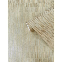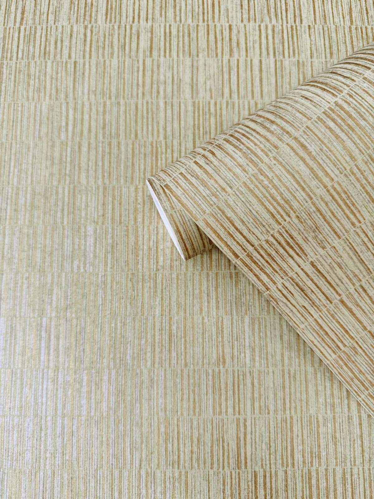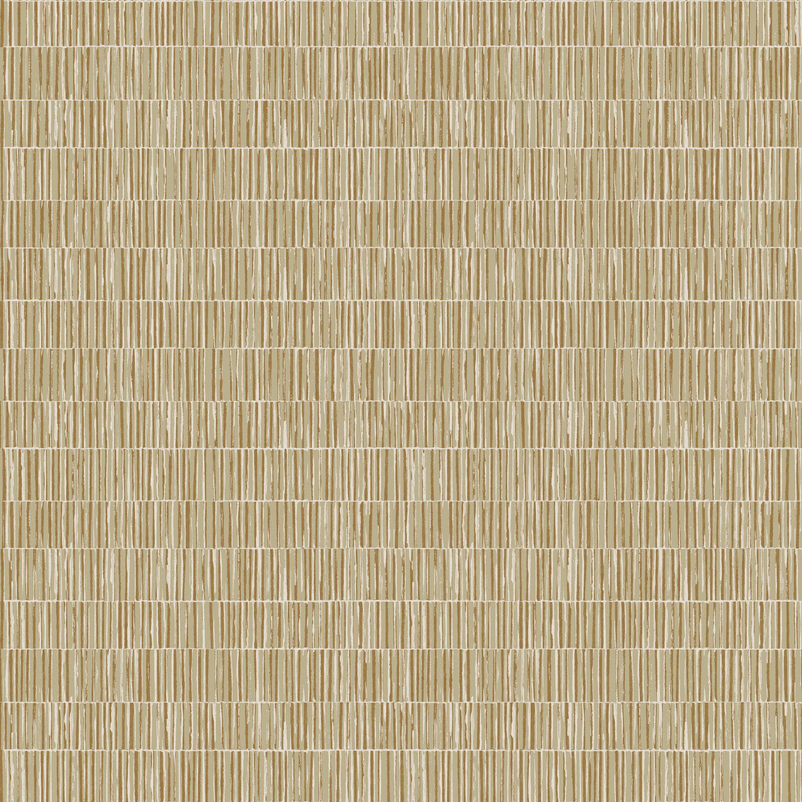 Simple abstract stripes stack together in long horizontal sections, offering a tiling effect or vertical striping reminiscent of a bamboo field. Thin stripes with metallic highlights have dimension. The Sand & Gold colourway features a striping design in shades of cream, neutral, and metallic gold.