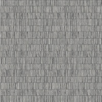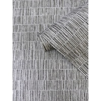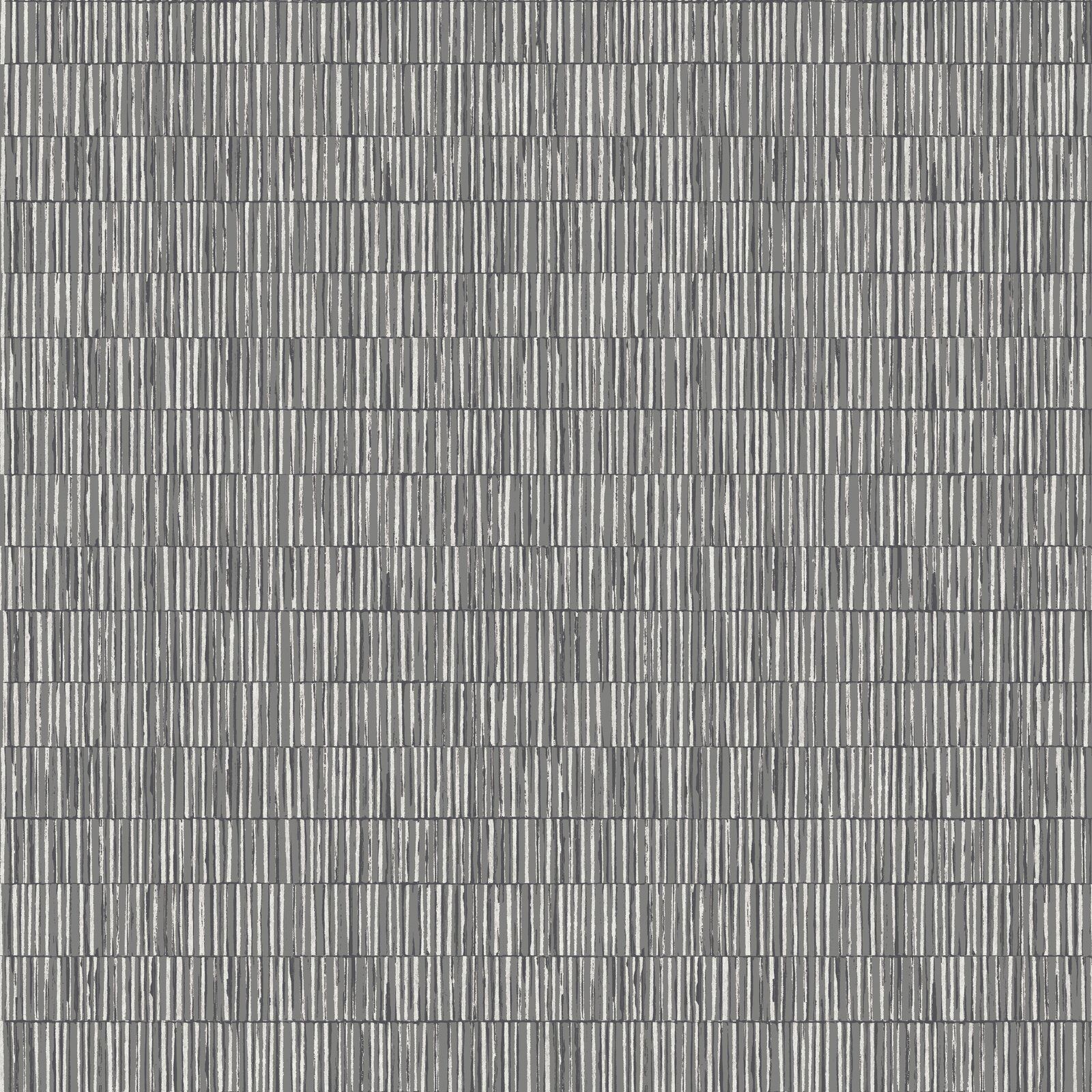 Simple abstract stripes stack together in long horizontal sections, offering a tiling effect or vertical striping reminiscent of a bamboo field. Thin stripes with metallic highlights have dimension. The Silver colourway features a striping design in shades of grey, charcoal, and metallic silver.