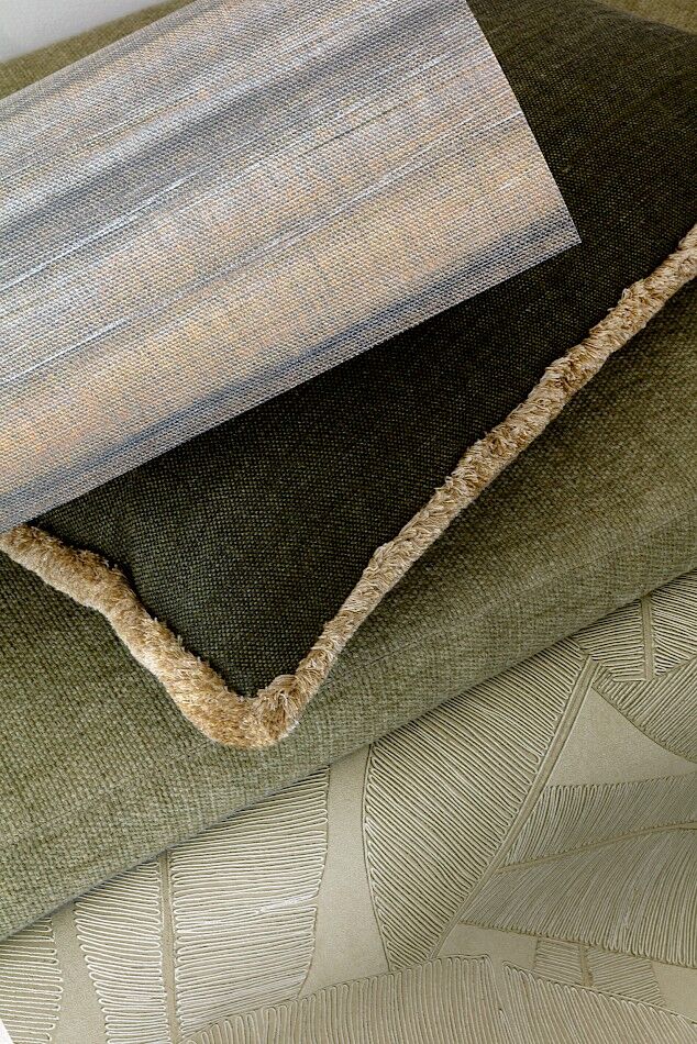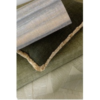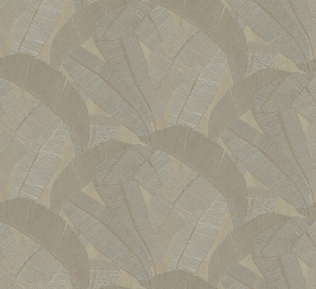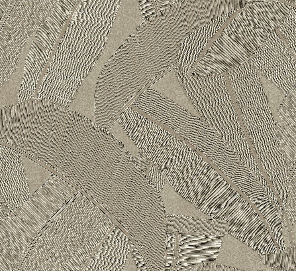 With a faux-string look, these large banana leaves offer a rich textural look, reminiscent of a silk or woven fabric. In soft monochromatic colours with metallic highlighting, the Banyan design is sure to wow. The Elm colourway features a deep green-grey base with banana leaves formed by charcoal and silver string forms.