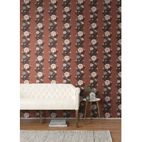 Blooming Stripe displays ornate floral elements in a striping formation over a matte background with complementary colours making for a traditional design. The Dark Blue colourway features a navy blue base with floral elements in shades of light blue, red, and white.