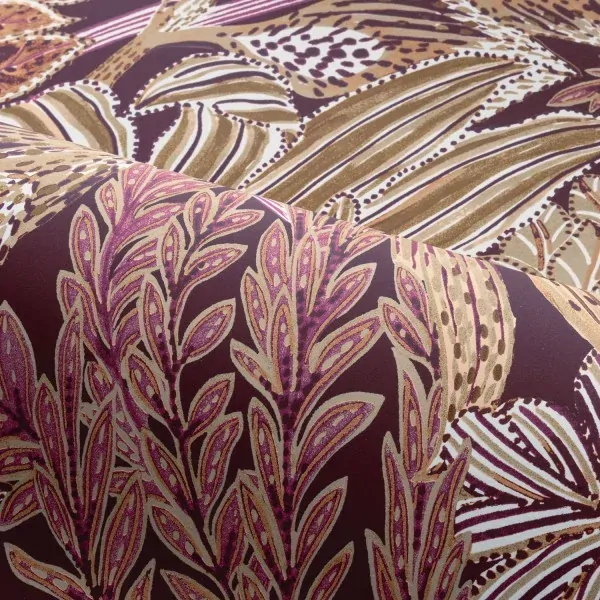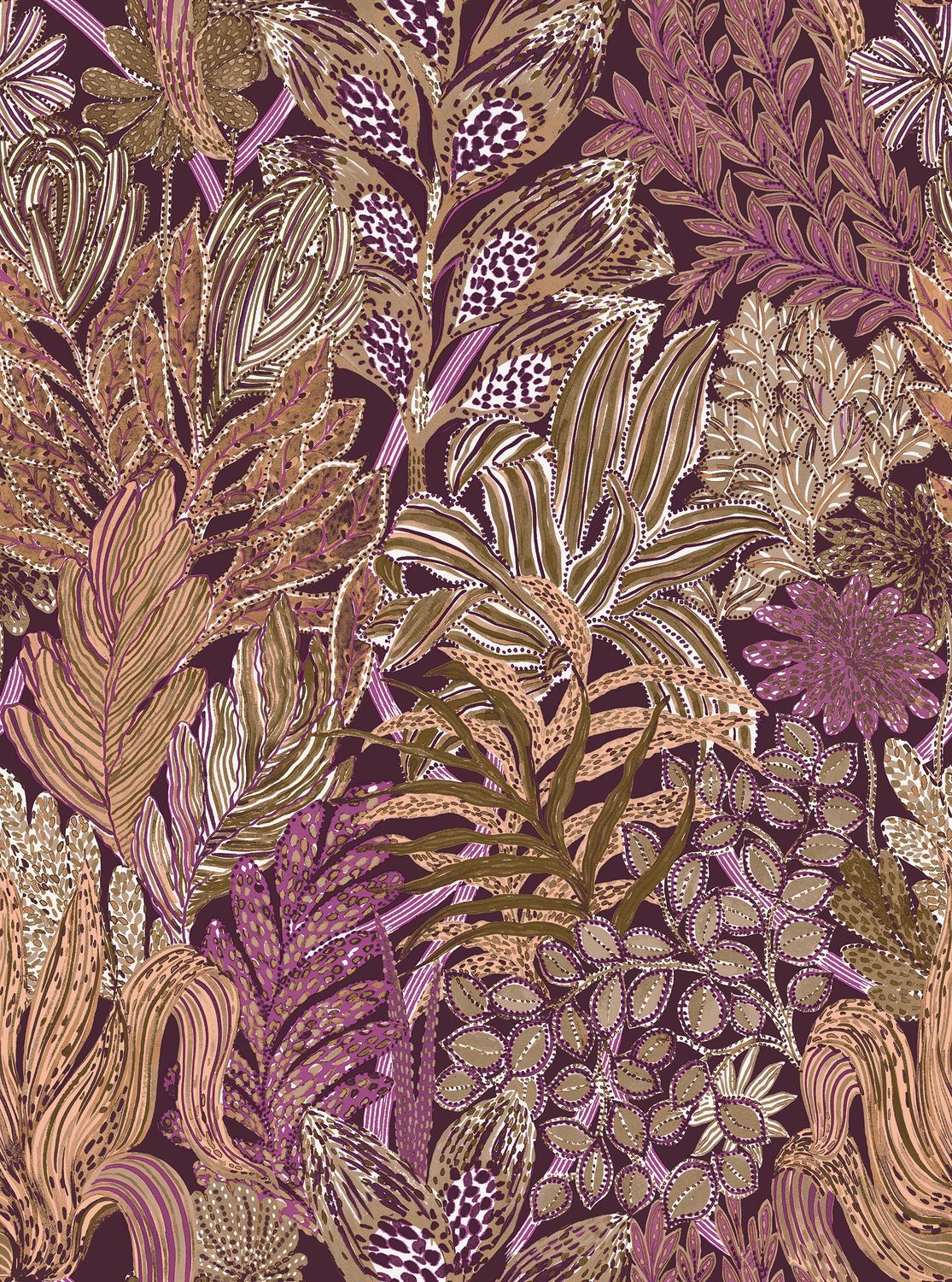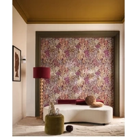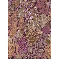 Like an invitation to travel, BORROMEE invites us to explore the depths of its graphics and colors. BORROMEE is an explosion of plants, a life-sized secret garden, a magical atmosphere where nature takes up all the space.The Purple / Olive colourway features a deep maroon-purple base with foliage details in shades of purple, olive, beige, and white.
