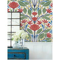 Carmela features a traditional style design of mirrored florals, showing symmetry on either side of a taller more prominent flower in the design. The simple colours and shapes offer a vintage look to this fun natural pattern. The Primaries colourway features a crisp white base with floral elements in shades of rich blue, red, yellow, and green.