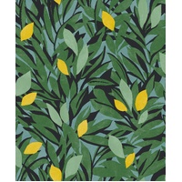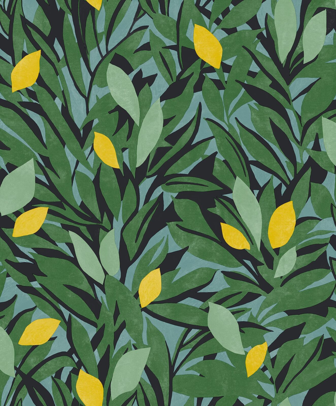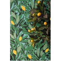 It is like the South... Lemon trees have their place in the sun in this vitamin/packed vegetal pattern in three colour 'intensities' from light to bright green always with a hint of luminous yellow. Our favourite! The Leafy Green and Yellow colourway features a blue base with bold green and black leaves and lemon motifs in bright yellow.