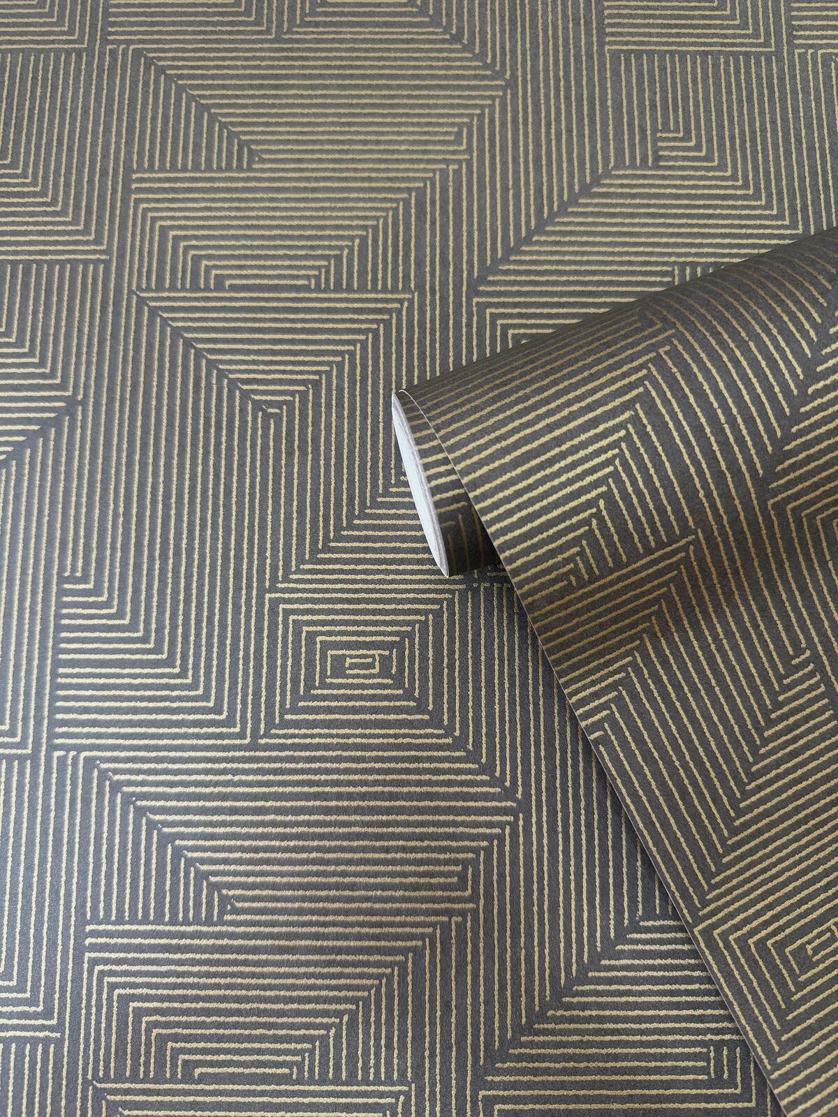 Fine, slightly raised pinstripes are arranged in angular patterns to create a stunning Egyptian inspired geometric design. Subtle metallic highlights and an ultra-thin design makes this truly eye-catching. The Charcoal & Gold colourway features a rich charcoal grey base with metallic gold pinstripe details.