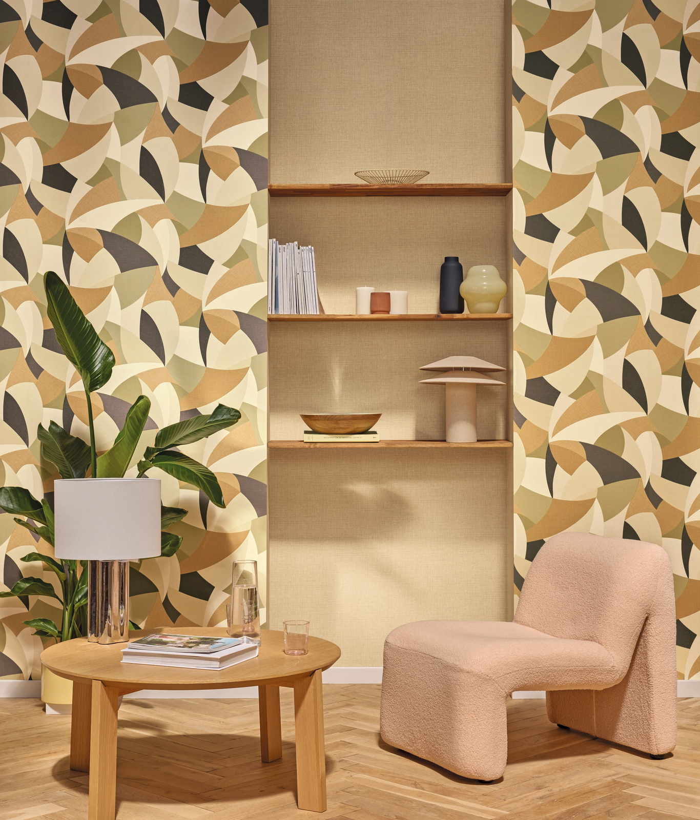 The highlight of the collection! A veritable patchwork of materials and colours, this pattern plays with effects and complexity like an abstract masterpiece. Available in several harmonious shades. The Green & Camel colourway features soft shades of cream, green, charcoal and beige with a rough linen texture and subtle shine.