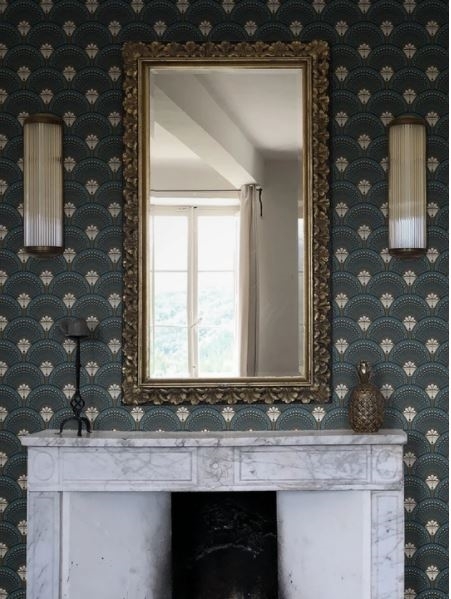 An Art Deco inspired design that brings Gatsby glamour to your home. With exquisite colours of teal, gold and black, this works particularly well as a living room wallpaper. Classic has never looked so iconic. Inspired by the Roaring Twenties and the decadent tastemakers of the jazz age, this bold graphic print brings Art Deco opulence to your interior with our Divine Savages twist on the traditional fan motif, featuring a hidden martini glass within the design.