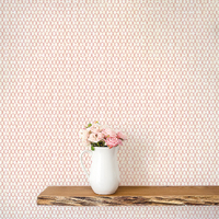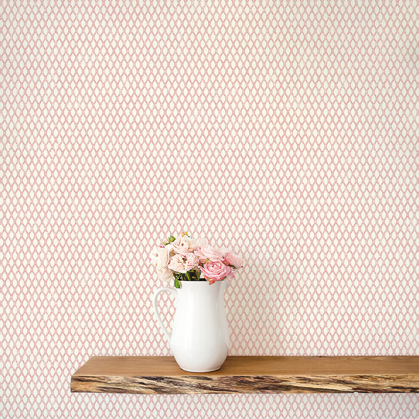 The Double Links design features simple shape elements in a classic trellis formation. With a rustic and weathered look, the geometric elements gain a softer effect. The Cranberry colourway features warm red geometrics over a chalky white background.
