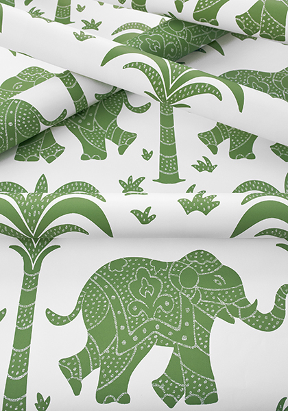 Elephant by Thibaut features indian style elephants with subtle patterns adorning the creatures and surrounding palm trees. With soft touches of such a bold design, this wallpaper is simple yet sophisticated. In six different colourways, there's a style for everyone! The French Blue colourway features light blue patterned motifs over a white background.