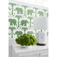 Elephant by Thibaut features indian style elephants with subtle patterns adorning the creatures and surrounding palm trees. With soft touches of such a bold design, this wallpaper is simple yet sophisticated. In six different colourways, there's a style for everyone! The Green colourway features green patterned motifs over a white background.