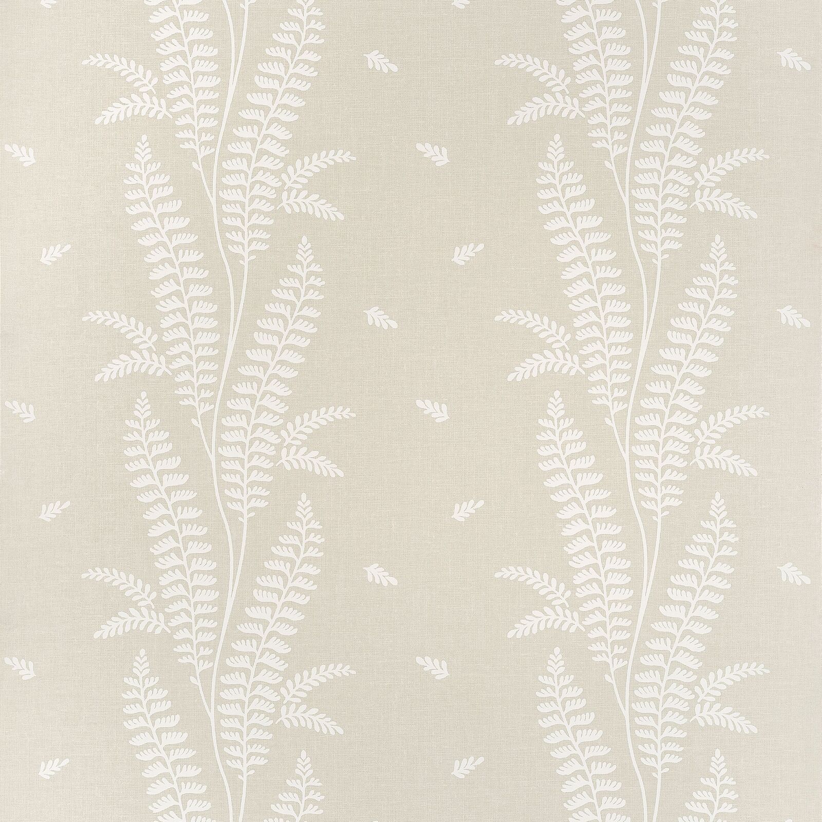 Ensbury Fern features a vertical stripe of loosely gathered ferns with small sprigs floating between. The light and airy design has a subtle texture that is maintained in the printing process for the wallcovering. The Beige colourway features a soft neutral base with creamy white fern details over top.