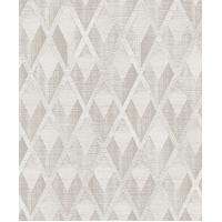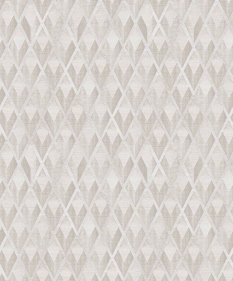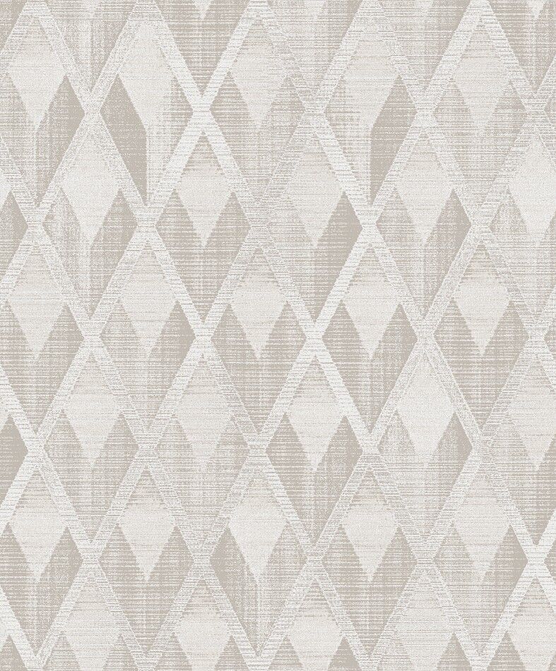 The Facet pattern uses a doubled diamond formation to enrich a space. The geometric formations come as smaller diamonds within larger diamonds, all with unique shading effects and an all-over texture reminiscent of a weaving fabric. The Ivory colourway features a taupe/neutral base with cream and metallic silver markings creating the diamond formations.