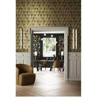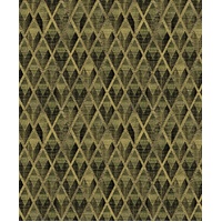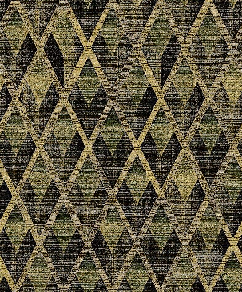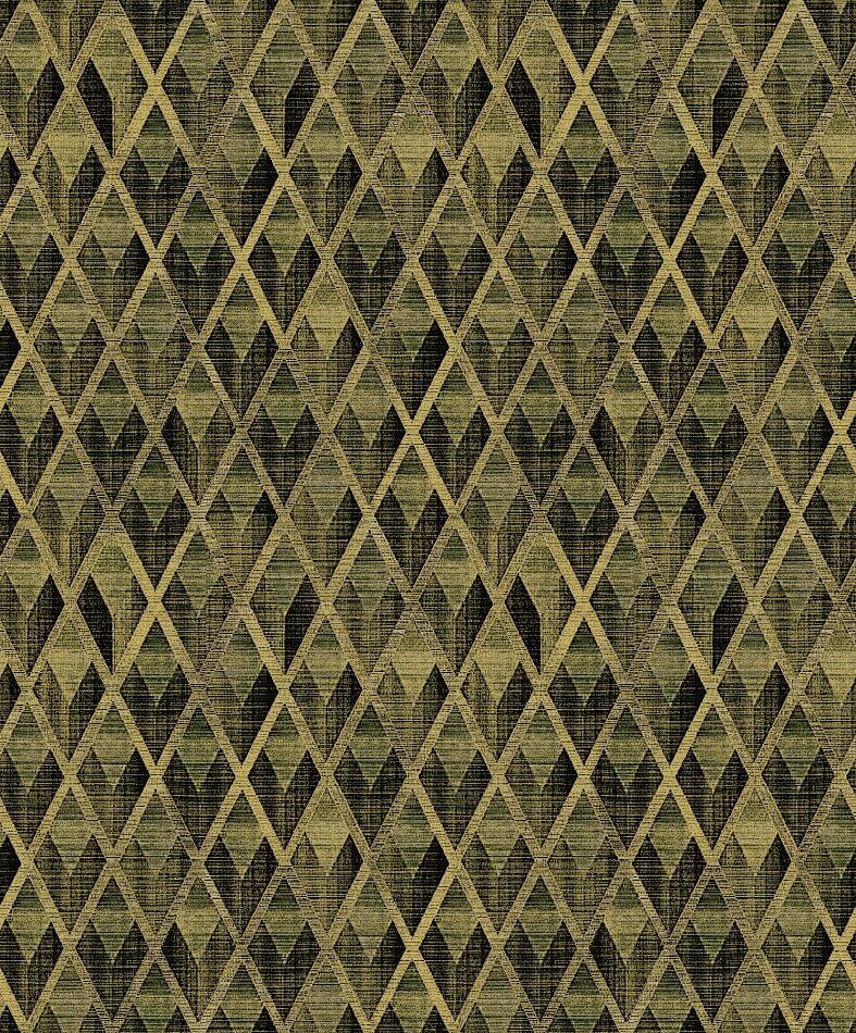 The Facet pattern uses a doubled diamond formation to enrich a space. The geometric formations come as smaller diamonds within larger diamonds, all with unique shading effects and an all-over texture reminiscent of a weaving fabric. The Jungle colourway features a charcoal black base with green and metallic gold markings creating the diamond formations.