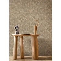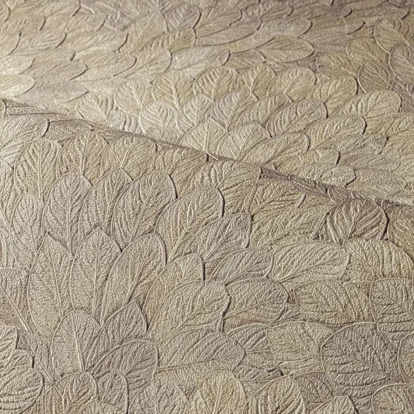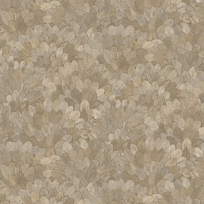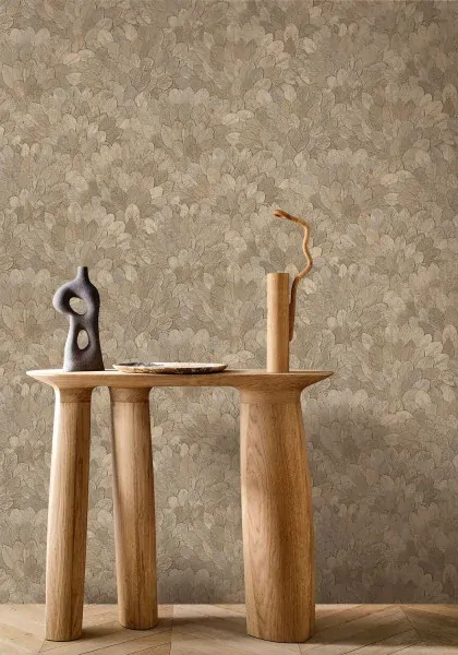 The design of FEIJOA is inspired by the foliage of the Brazilian guava tree. It is created by assembling small leaves in a wreath. The foliage is realistically reproduced on a vinyl base and stands out from the walls thanks to subtle shadow effects. The Travertine colourway features textured leaf litter in a warm grey shade.