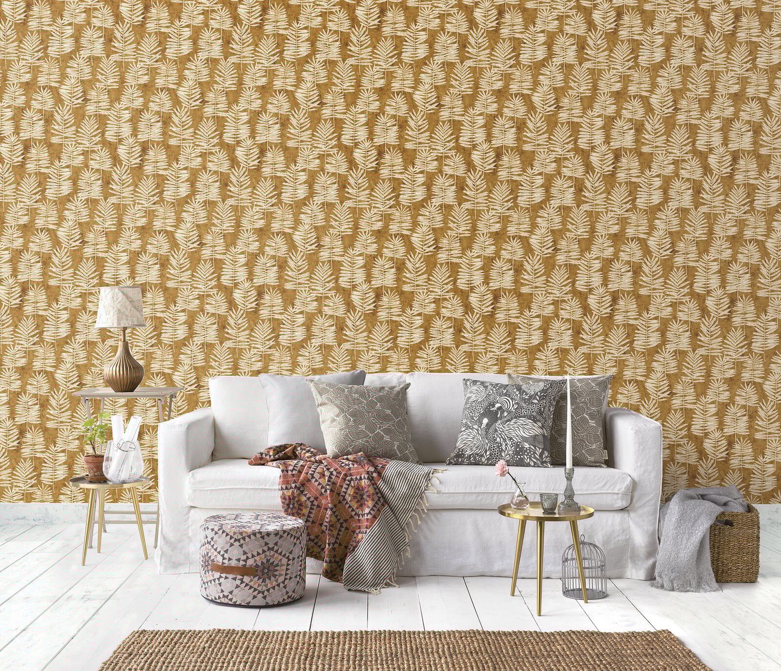 The Fern design features a cool fern motif stamped atop a linen-like base. With soft metallic highlights throughout and subtle textural details, this nature-inspired design offers a simple yet eye-catching natural element to your space. The Bronze colourway features a rich bronze-gold base and foliage stamps in a creamy white shade with thin gold highlights.