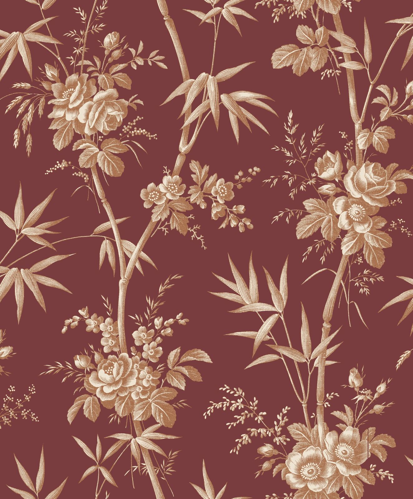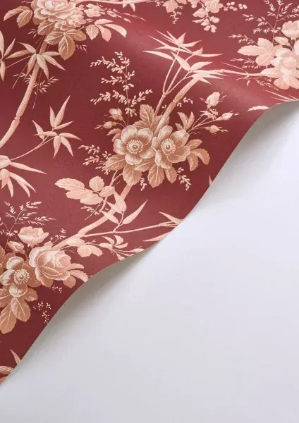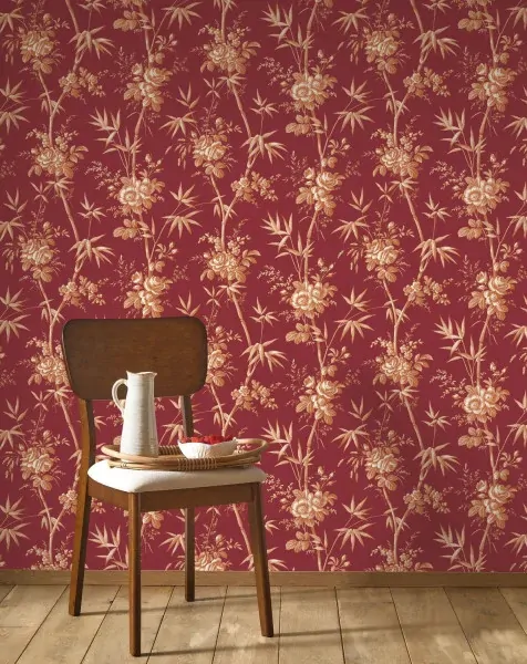 A touch of French charm. With Flânerie, leaves, stems and flowers intertwine with panache to adorn your walls. This botanical armada features bamboo, roses and mysterious grasses, creating a lush yet harmonious effect. The Garnet Red colourway features a deep maroon red base with metallic copper foliage details.
