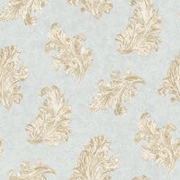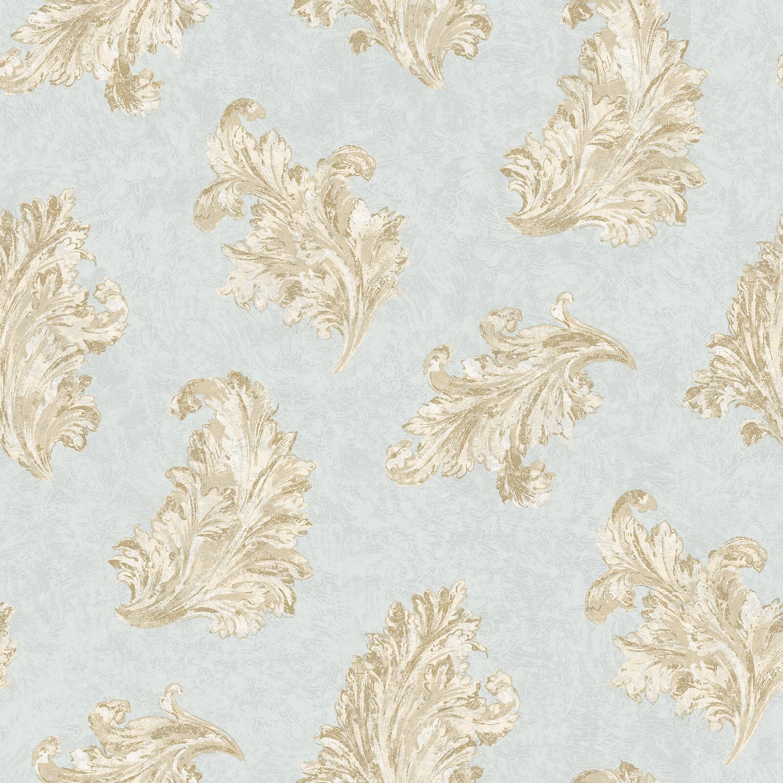 Reminiscent of ancient architecture, an ornamental damask is luxurious and inviting. With swirling acanthus leaves in a simple floating formation and a rich silk-like texture featured throughout, this design is sure to wow. The Pale Blue colourway features a pale blue base with cream and metallic gold toned acanthus leaves.
