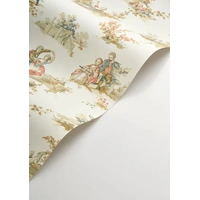 Come on, let's dance! The gavotte, a dance that has evolved from village balls to the courts of Versailles, inspired this festive collection. Shepherdesses and peasant girls give way to countesses and gallant parties. Peacocks in a park and hunting scenes complete this picturesque scene from the Ancien Regime. The Multi colourway features a creamy white base with town scenes in shades of blue, cream, beige, and pink.