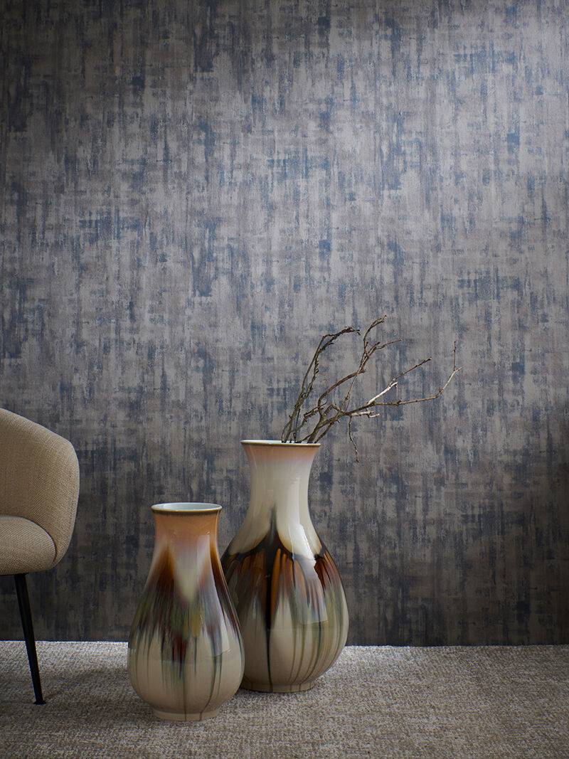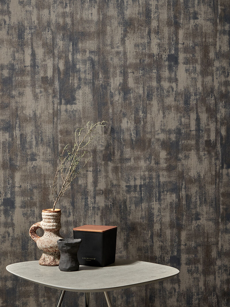 Gideki combines colour and texture for the ultimate understated wall feature. Washed patches similar to limewash or a washed canvas create depth and texture on an otherwise plain design. The Cinder colourway features a taupe base with washed patches in shades of metallic grey-brown and charcoal.