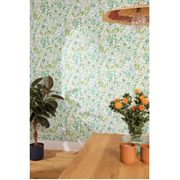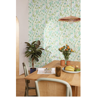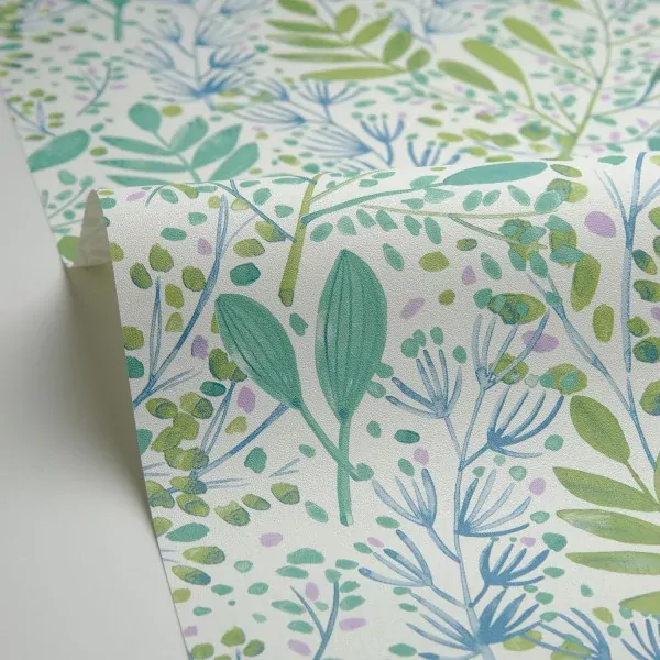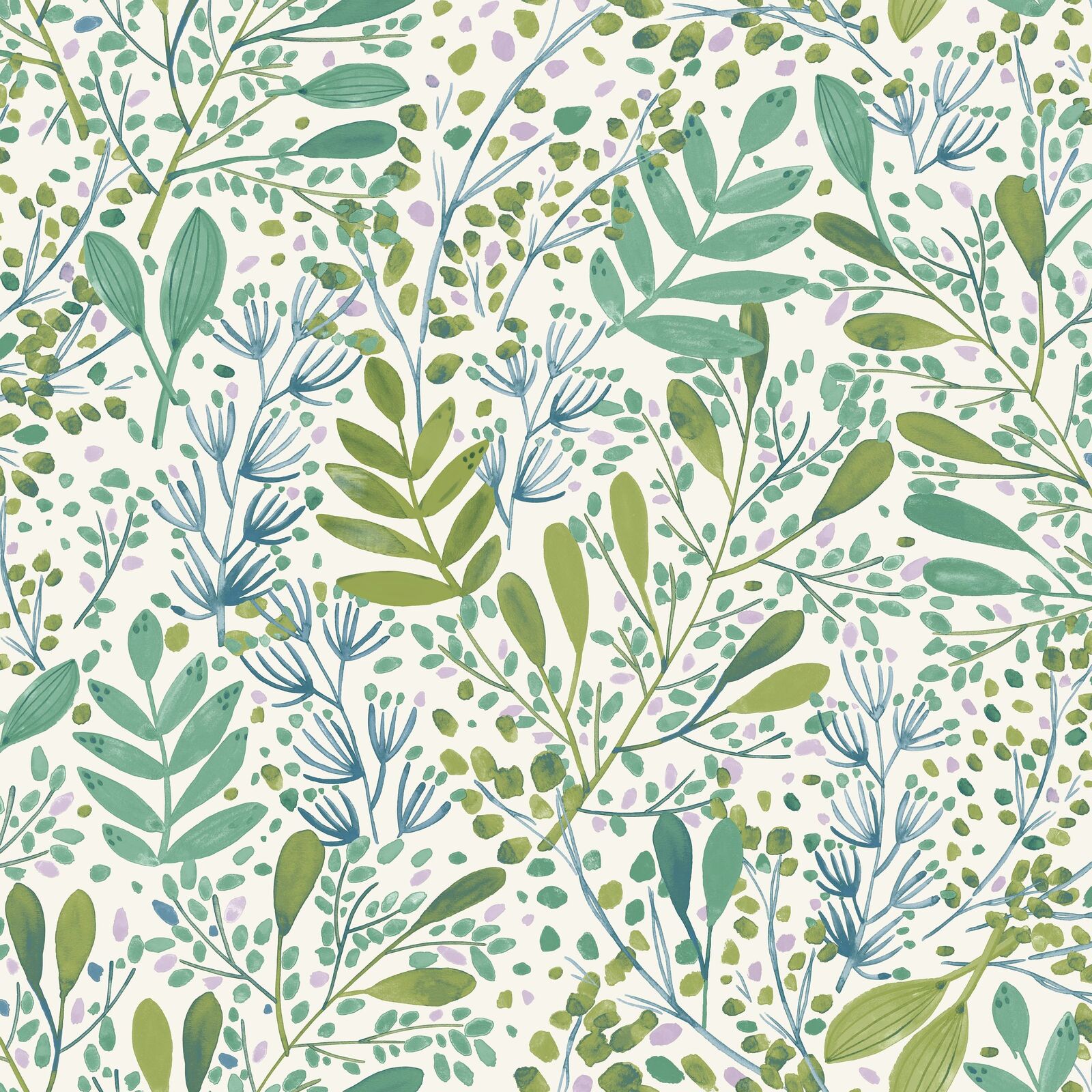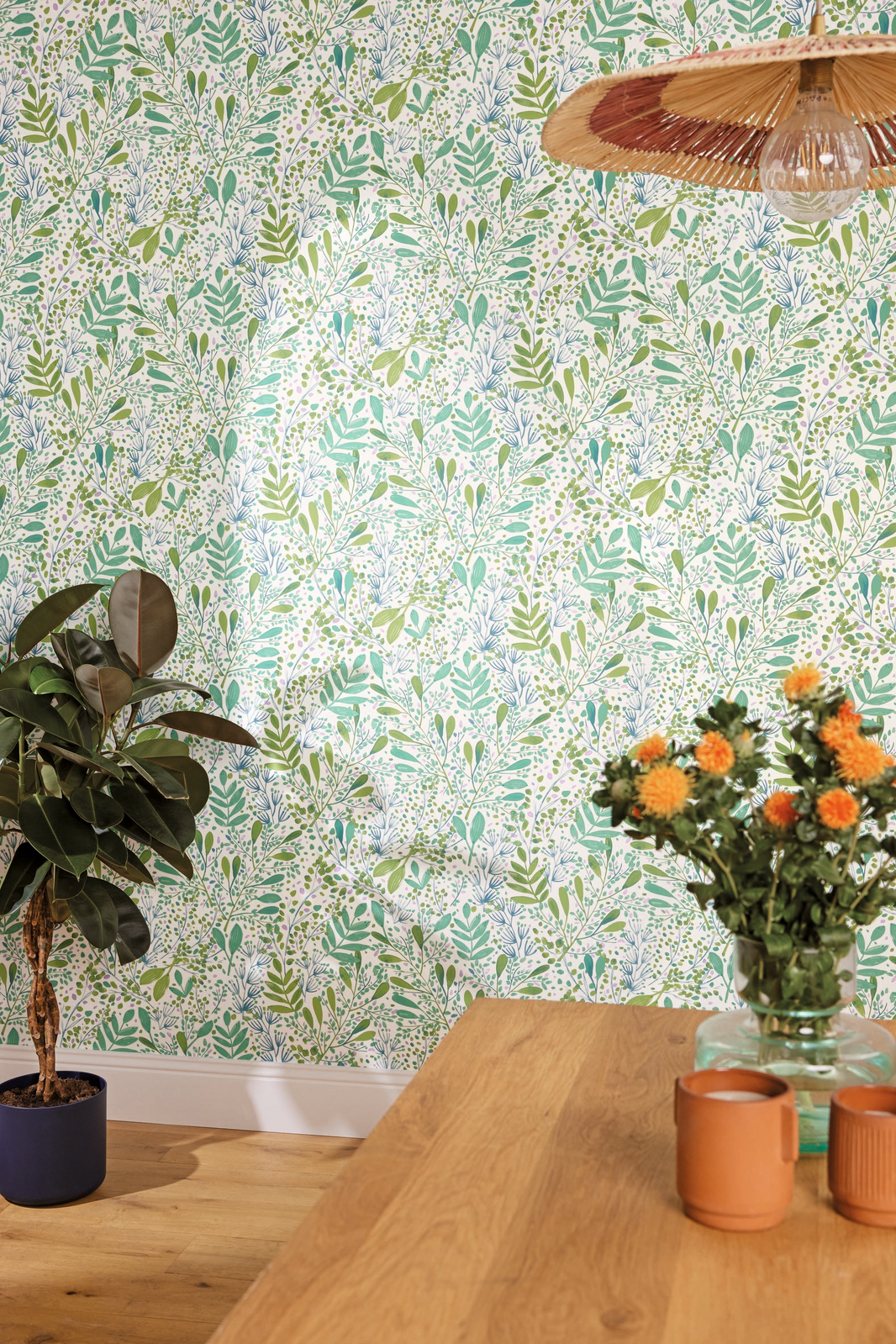 Oh joy, it is the darling of the collection! We love JOY and its beautiful leaf design that comes in a wide range of new colours, probably the most complete in the collection. Choose a light background for added freshness or a dark background for a lush interior with character. The Green & Purple colourway features a soft white base with soft foliage motifs in shades of green, teal, and purple.