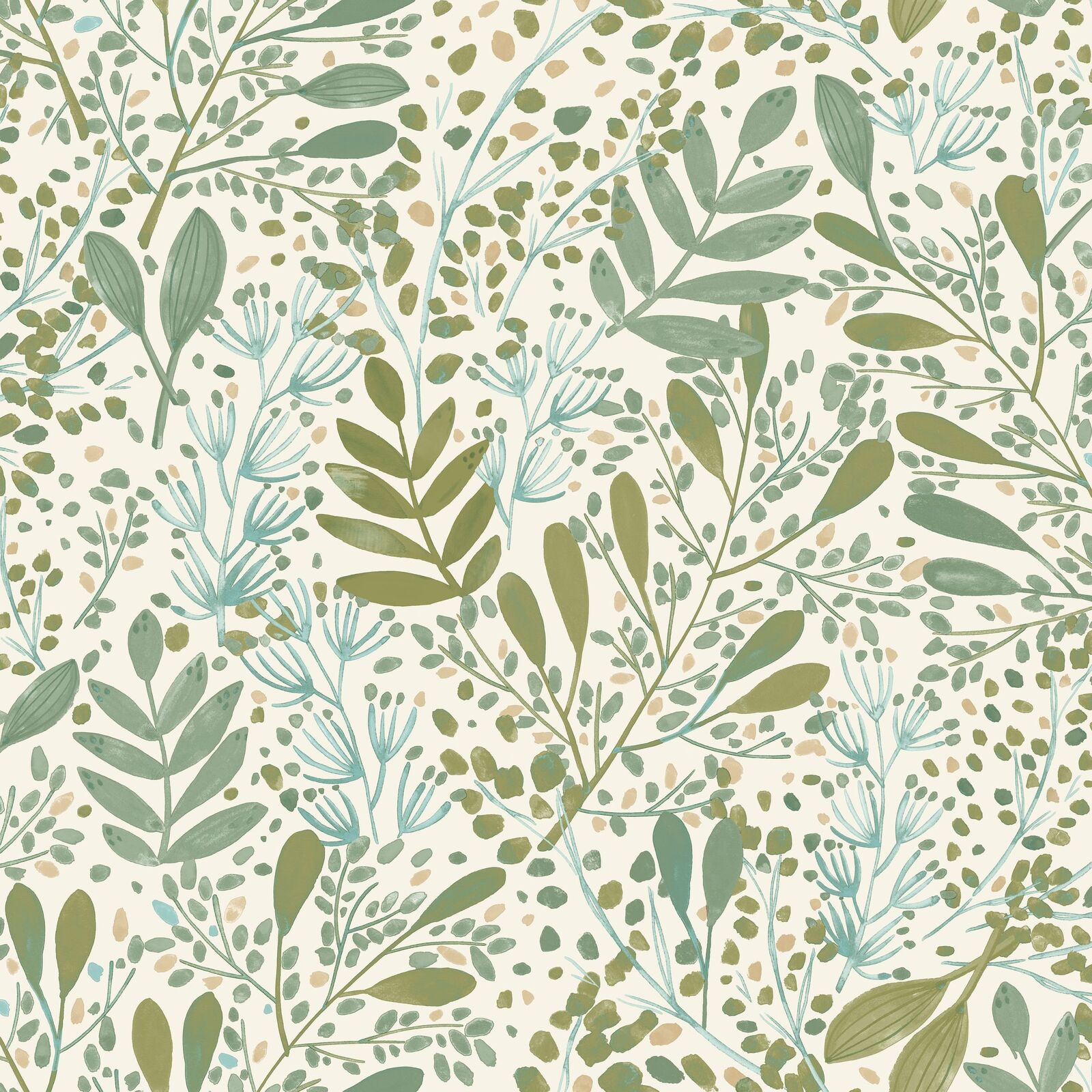 Oh joy, it is the darling of the collection! We love JOY and its beautiful leaf design that comes in a wide range of new colours, probably the most complete in the collection. Choose a light background for added freshness or a dark background for a lush interior with character. The Moss Green & Gold colourway features a soft white base with soft foliage motifs in shades of green and soft blue with some spots of metallic gold.