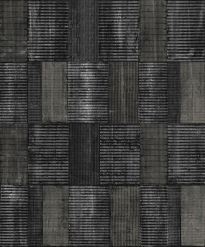 Gyan consists of geometric blocks decorated with small stripes - each print perfectly imperfect to reflect the organic feel of traditional hand-printed fabrics. The Rock colourway features a black base with stripes stamped in shades of taupe, dark silver, and pearly silver.