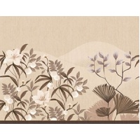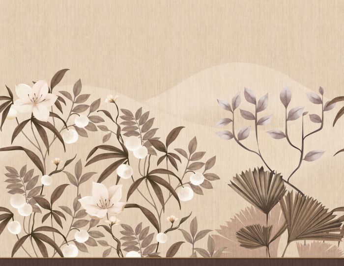 Sophisticated bouquet. Less exuberant than Brasilia, Hévéa invites you to a botanical garden of dreams. Here, beautiful flowers, mysterious berries and refined fan-shaped leaves bloom. Nature is orderly, but not entirely so, as the beautiful tendrils on the stems show.