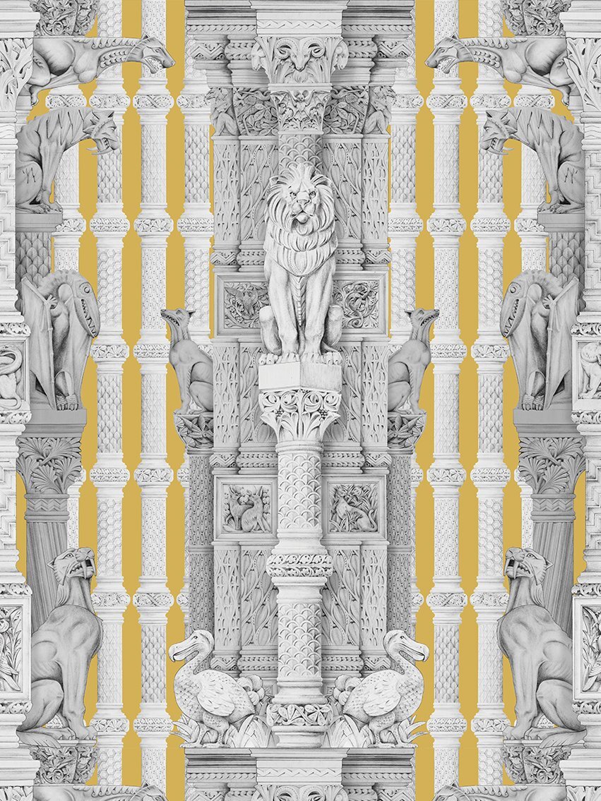 Hierarchy celebrates the intricately carved stonework that adorns the exterior of London’s Natural History Museum to create a striking wallcovering full of architectural splendour as well as the incredible natural world. The gargoyles featured here are not grotesque or of mythological form, but rather intricately carved animals, with a proud lion taking centre stage.