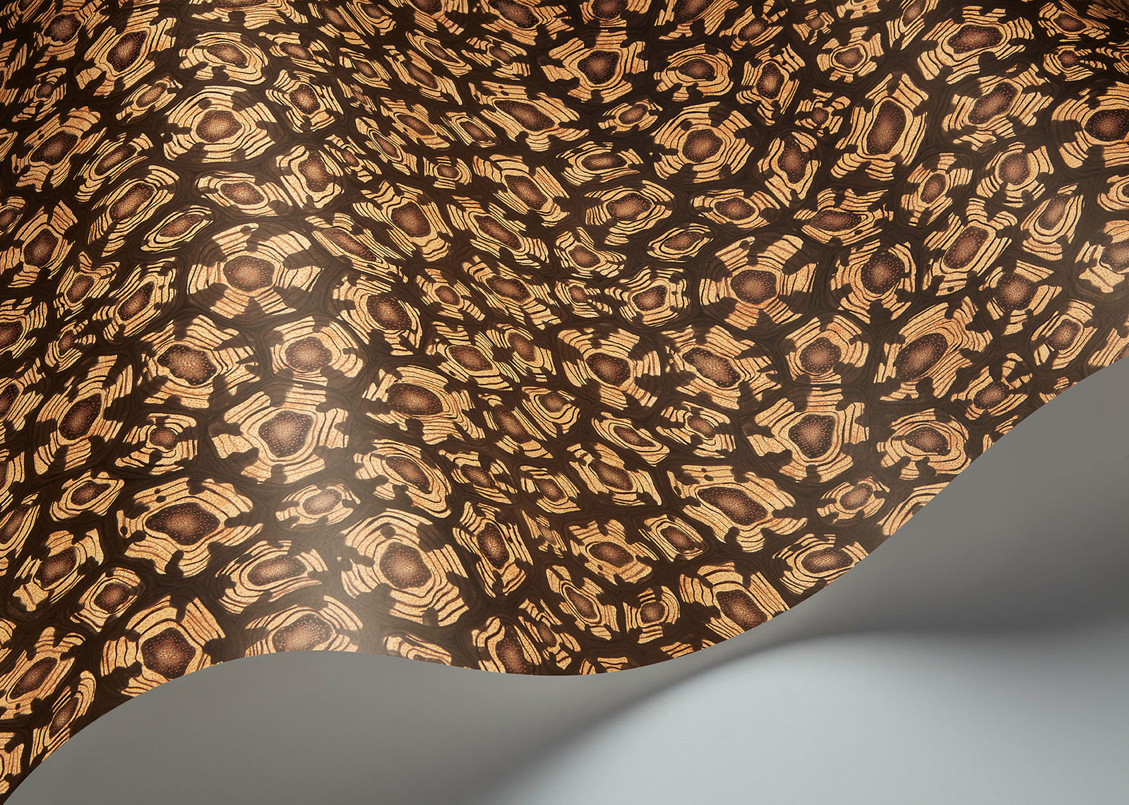 This lustrous small-scale design elevates an ordinary interior to an extraordinary experience. Savanna Shell was inspired by South Africa's Leopard Tortoise, whose beautiful markings mimic a leopard's rosettes. The tortoise's high, domed shell is covered with pyramid-shaped scutes that fit together like a puzzle in refracted light, as if the tortoise is swimming underwater or walking through dappled sun on the savanna. Burnished gold, silver and gilver enhance the effect of the tortoiseshell bathed in sunlight.