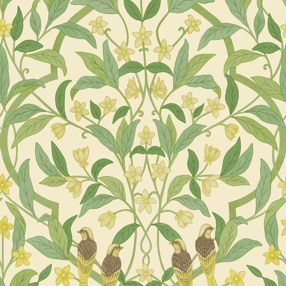 A foliage print wallpaper in Chartreuse & Olive Green on White