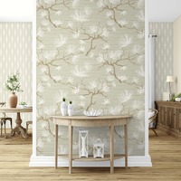 The Kiruna design is a sophisticated Chinois-inspired design featuring simple tree branches and luxurious textural elements. Each design has a soft metallic base and a soft grasscloth weave over the top for an abundance of texture and dimension. The Saddle Tan colourway features a metallic silver base with beige grasscloth weaves and Chinois branches in beige and white