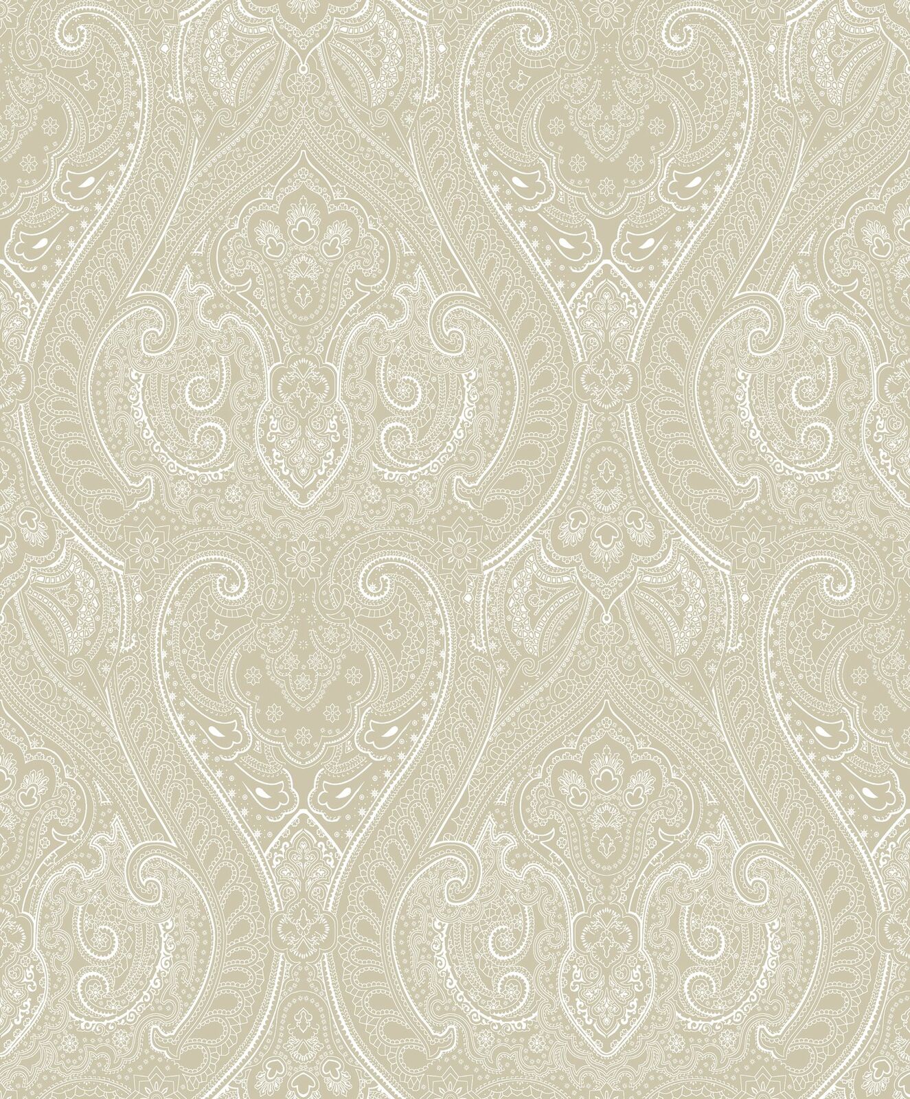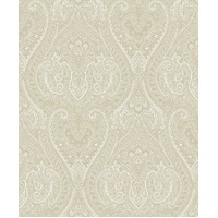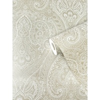 This visually striking wallpaper features an ornate design inspired by traditional damask patterns, harmoniously blended with the fluidity of paisley motifs. The Silver Pearl colourway features a soft metallic silver base with creamy white graphic details.