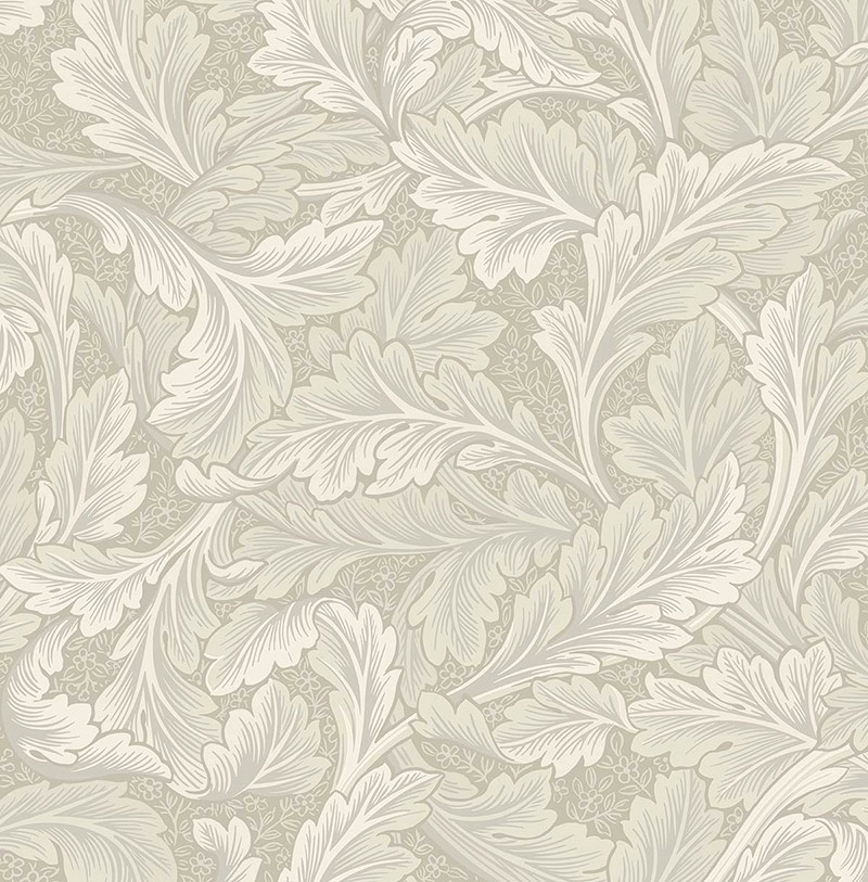 Leaf is based on the famous Acanthus design by William Morris, with its typical complex layering and vigorous curves. The scrolling acanthus foliage produces a sophisticated and delicate feel. In the arts & crafts style, the ornamented leaf design is described as a luxurious pattern. The Champagne colourway features a neutral/grey toned background adorned with light grey leaves.