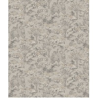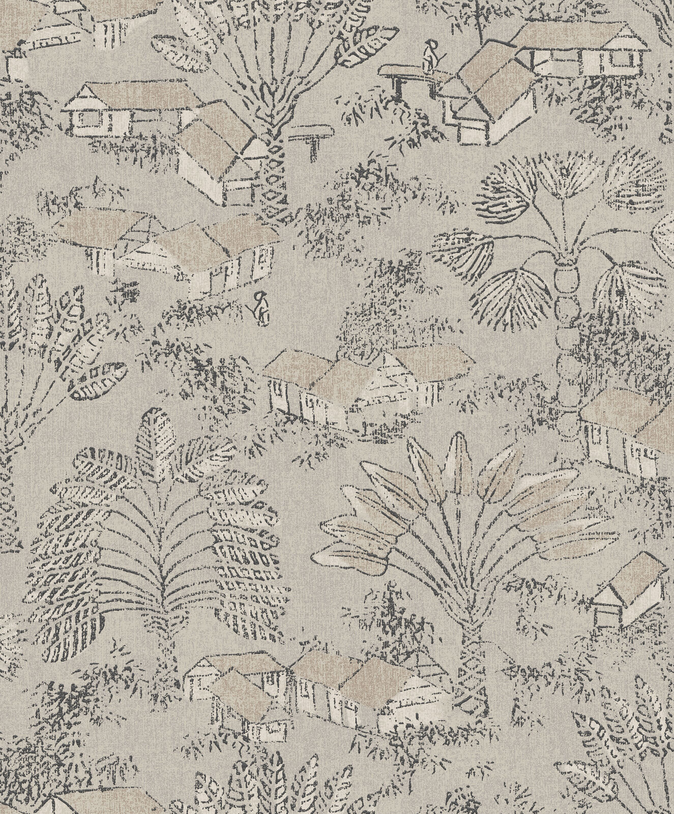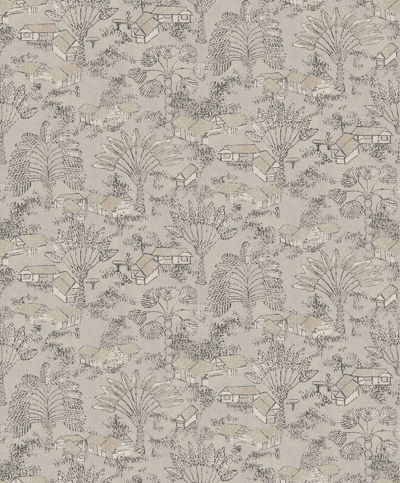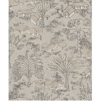 Louam presents a landscape formed by small houses and palm trees. With a soft texture all over, this design has a handcrafted look. The Papyrus colourway features a washed base of cream and metallic silver, with illustrations in matte charcoal and metallic gold.
