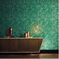 Makrana is a marbled-effect wide-width wallcoverings in relaxed colourways. Soft colours and metallics swirl together creating the perfect mix of shadows and highlights. The Emerald colourway features deep green and gold marble swirls.