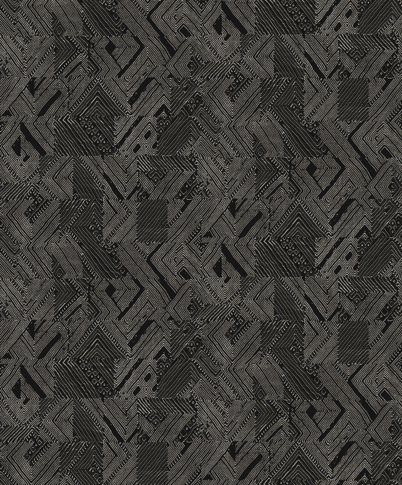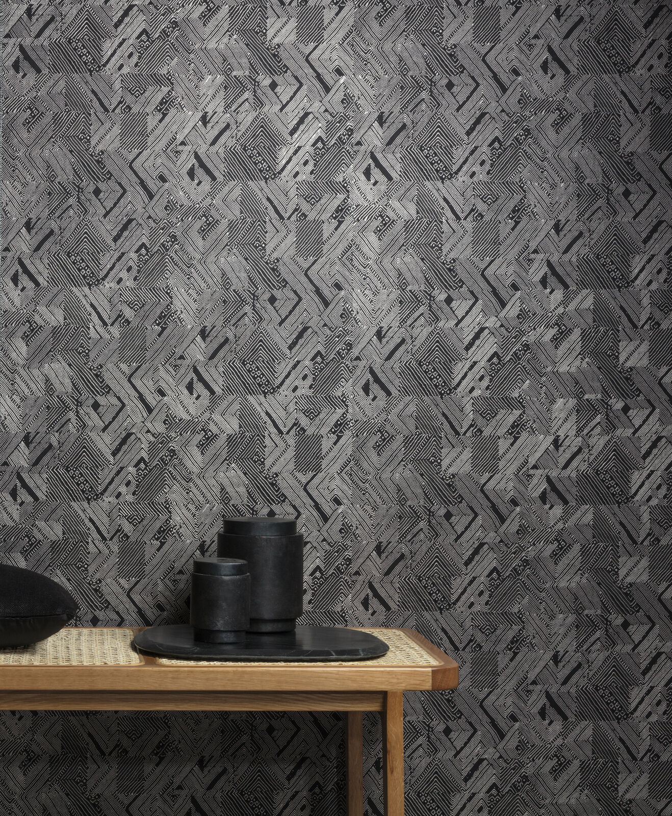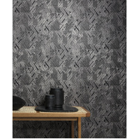 Manu is deep and intricate. Simple square tiles are anything but simple with intricate geometric designs filling each. From stripes to dots, this abstract geo is truly eye-catching. The Night colourway features a matte black base with textured geometric forms in metallic silver and brown.