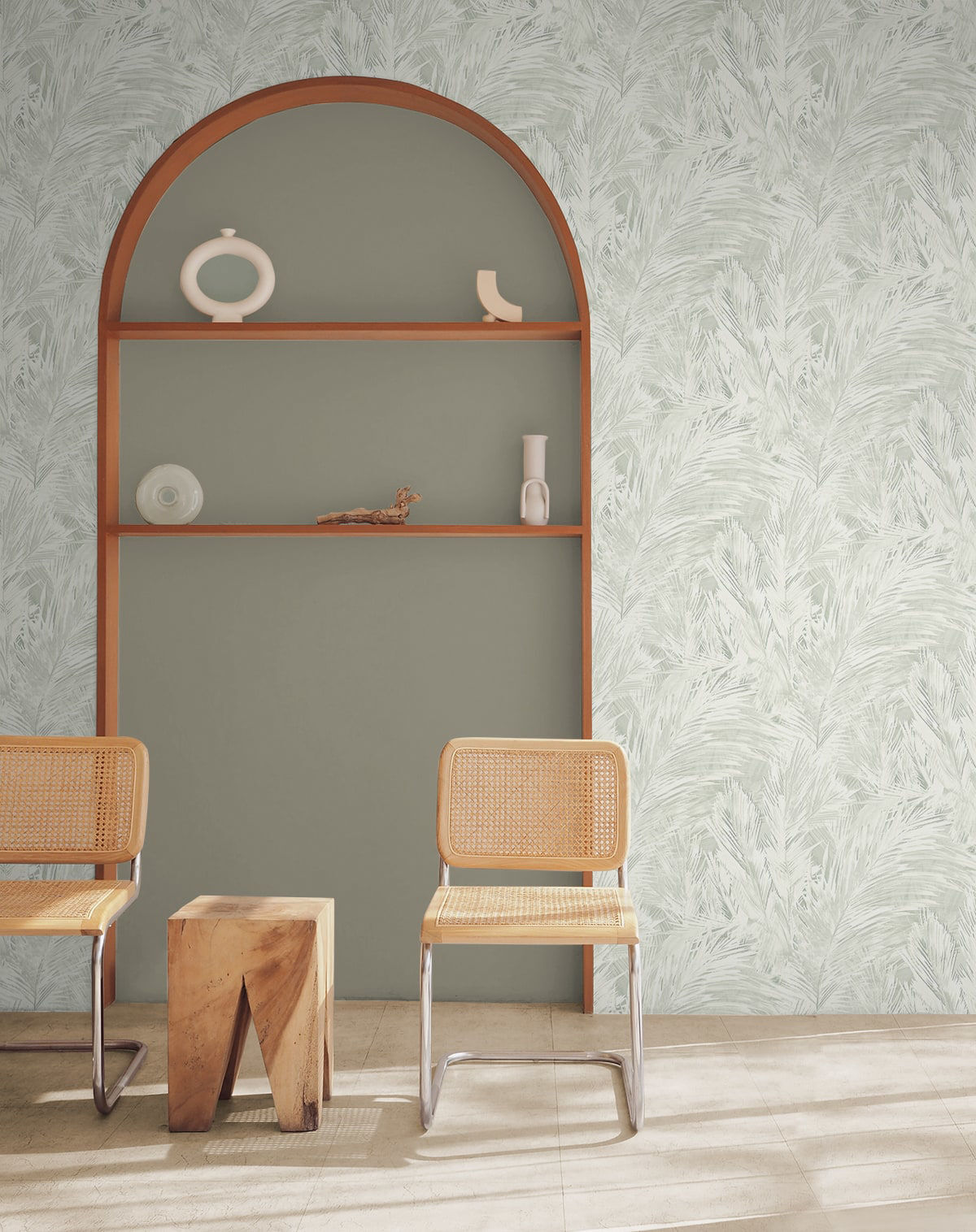 The Mari pattern is an embossed vinyl wallpaper with a textured palm leaf design. This design has a raised texture effect. The Moss Sago colourway features palm leaves in shades of white and soft green.