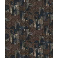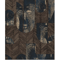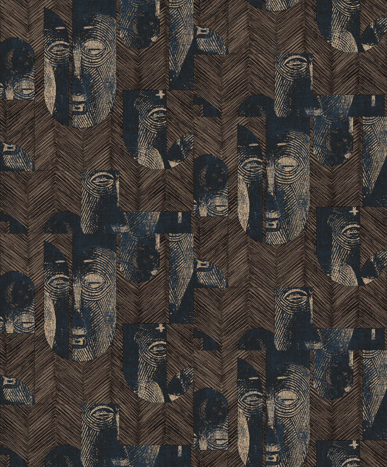 A contemporary design inspired by traditional tribal markings and natural wood grain. Naturally striped tribal masks sit atop a herringbone background, with textures reminiscent of wood. The Slate colourway features a brown, black, and gold herringbone look with tribal masks in a deep sea blue with flecks of black and copper-gold.