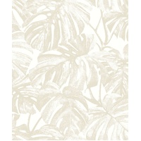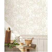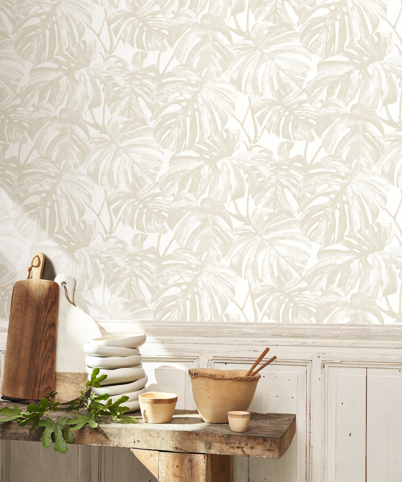 Beautiful silhouettes of plants. As a stencil, Monstera leaves can be cut into the walls. Sophisticated on its own, Mata can also be paired with bold furnishings for a vibrant interior look. The Beige String colourway features a creamy white base with monstera leaves in a pearly gilver shade.
