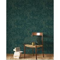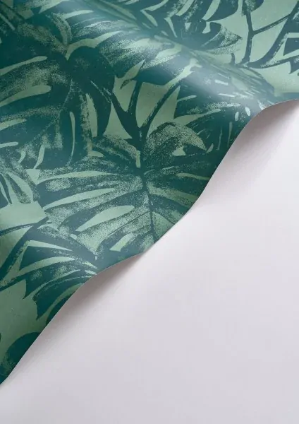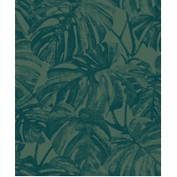 Beautiful silhouettes of plants. As a stencil, Monstera leaves can be cut into the walls. Sophisticated on its own, Mata can also be paired with bold furnishings for a vibrant interior look. The Forest Green colourway features a metallic green base with monstera leaves in a rich emerald / teal green shade.