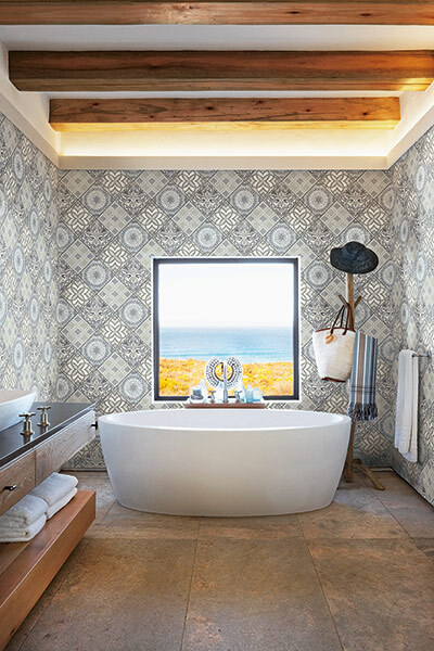 distressed federation tile look wallpaper in soft grey, charcoal and stone colours