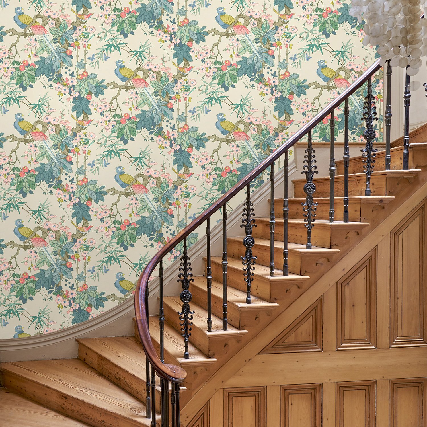 Against a simple, airy background, birds perch amongst bamboo and deliciously scented blossom; a wallpaper for any home. Presented in Blossom, a subtle and sophisticated colourway.