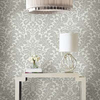Pattern Modern Romance's sinuous acanthus leaves unfurl in a redefining of traditional elegance reimagined in metallic, gloss, and monochrome colour. This design has a soft matte feel. The Grey colourway features a matte white background with damask foliage in a soft grey shade.
