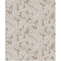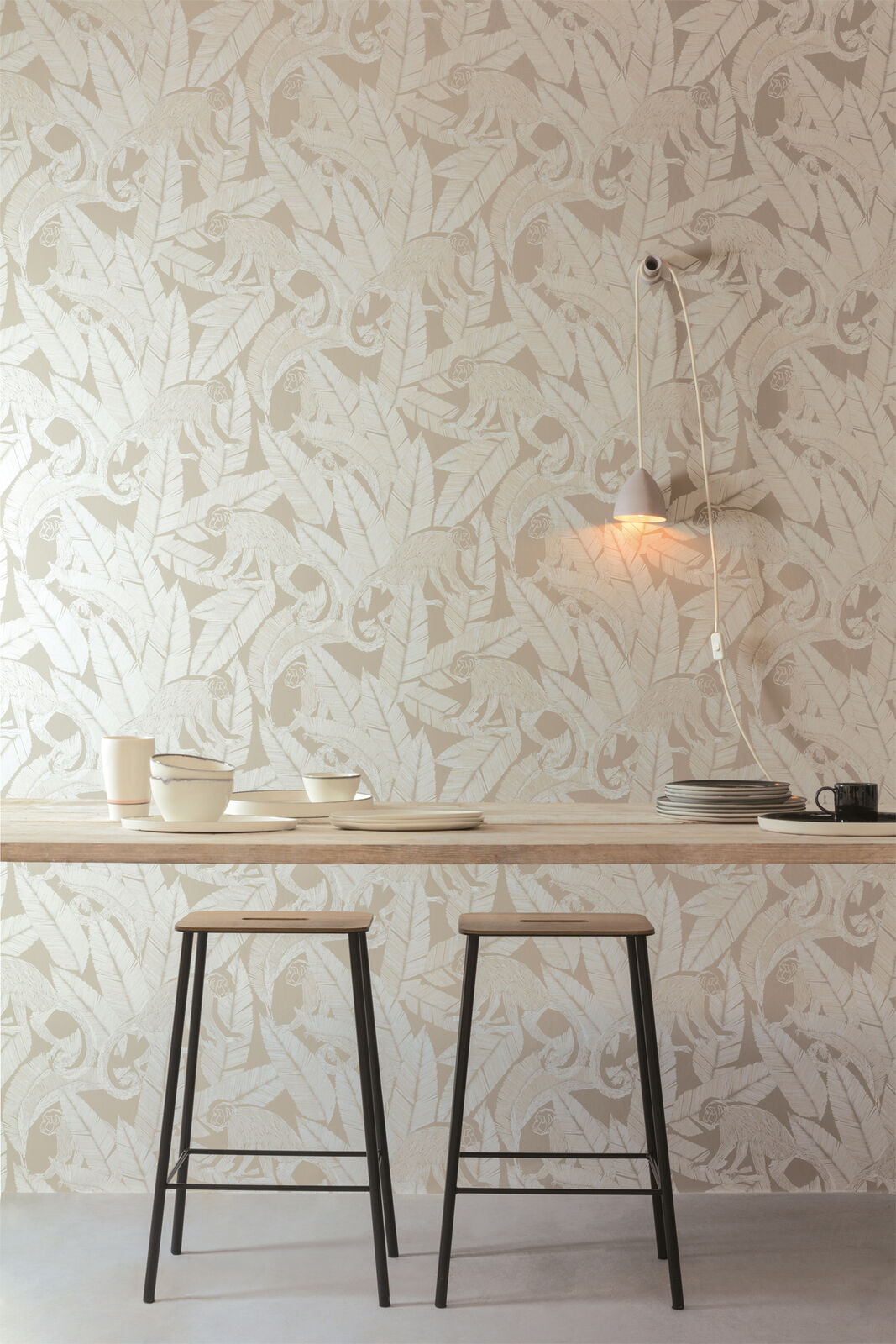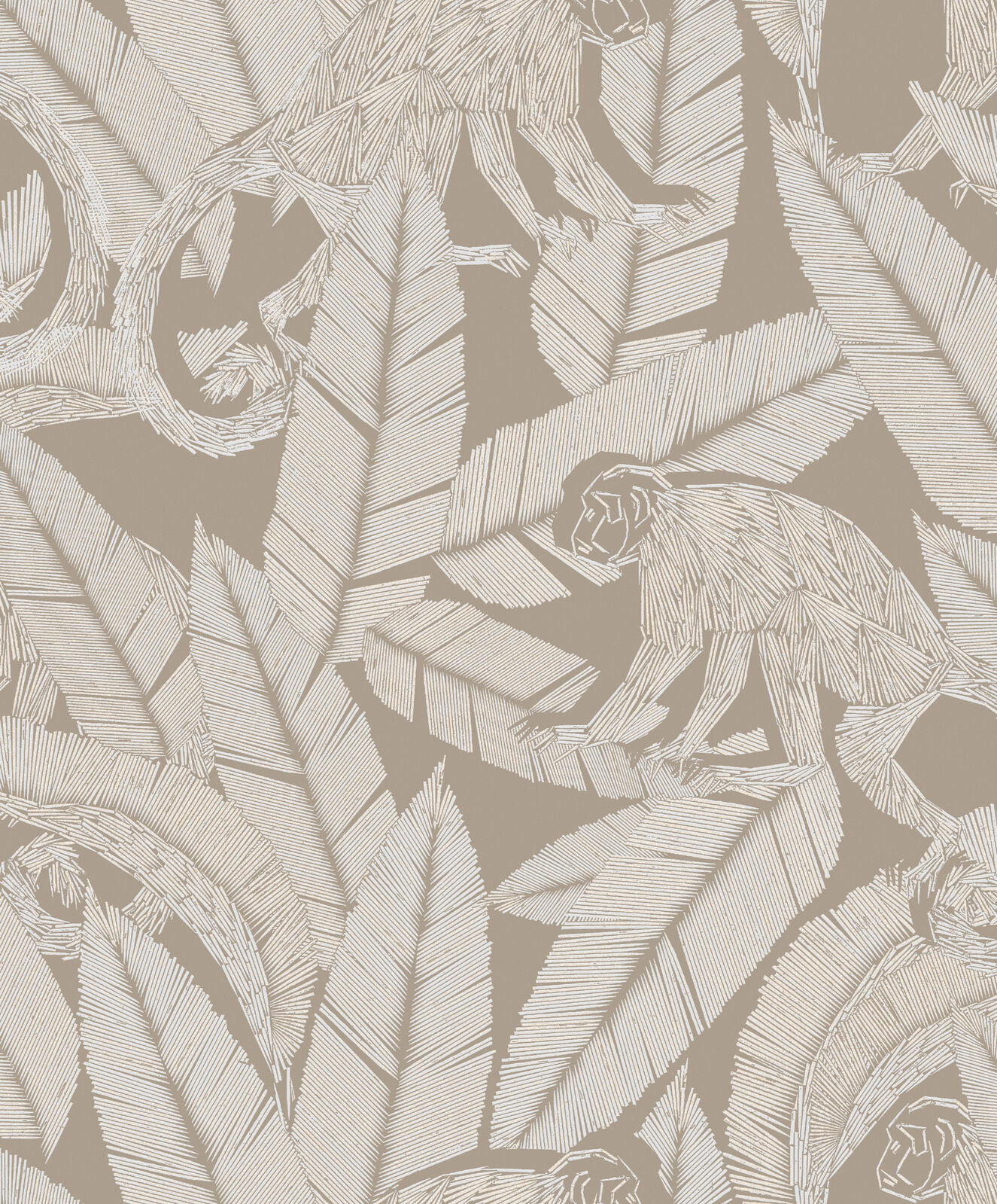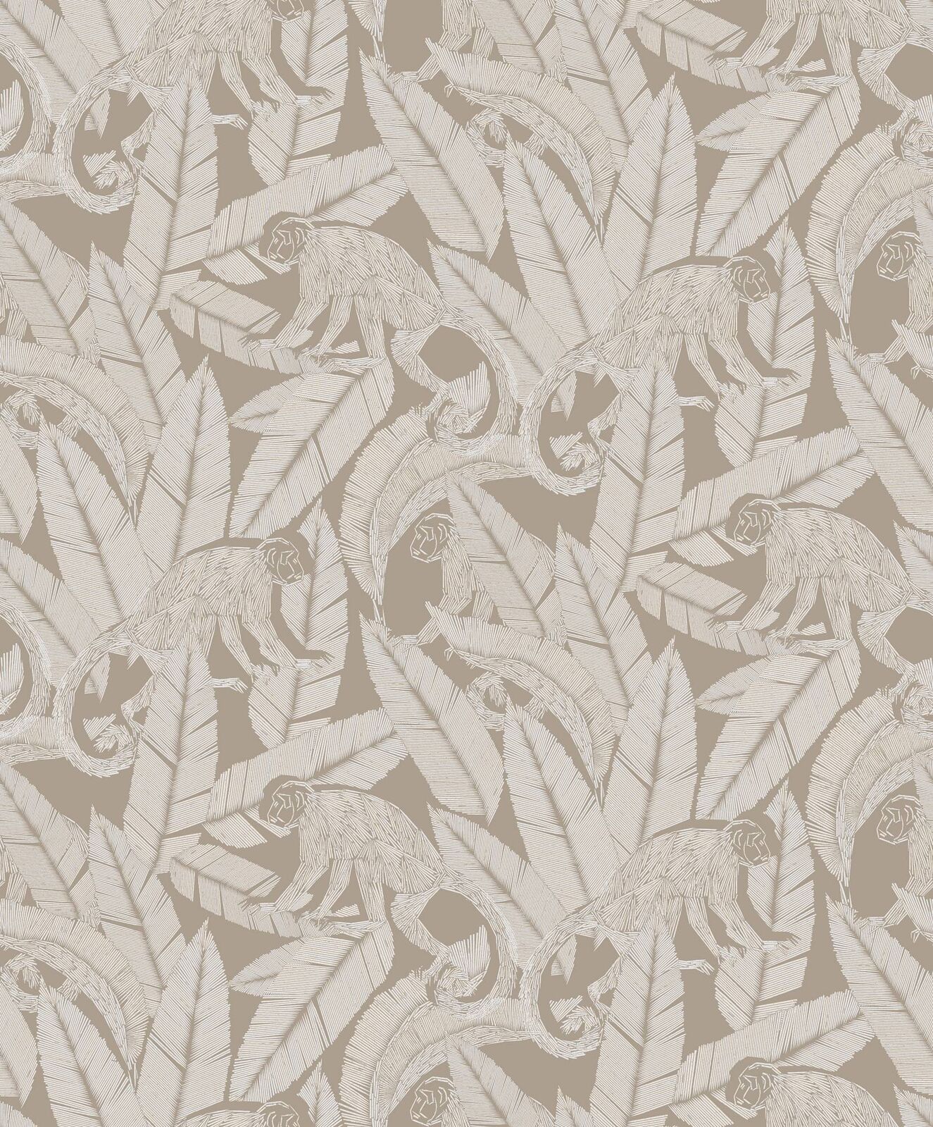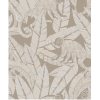 A design of playful monkeys amongst palm leaves with a rich etch-style formation. Monkey brings an exotic note to interiors with its tropical design and bold colourings. The Desert colourway features a matte taupe-beige base with monkey and palm details in white and metallic gilver shades.